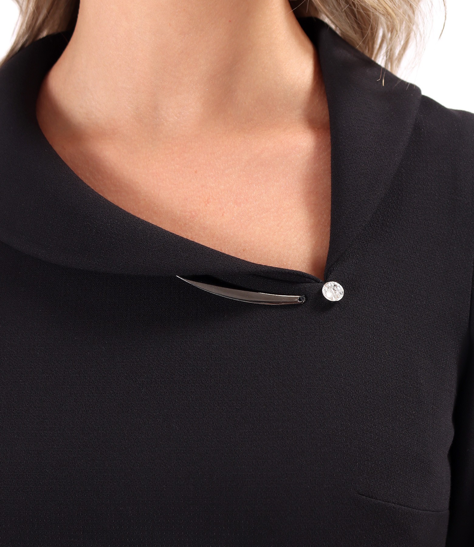 Office dress made of elastic fabric with viscose, lined, with 3/4 sleeves, asymmetric collar, and metallic and crystal appliqué at the neckline. It closes with a hidden zipper on the side.