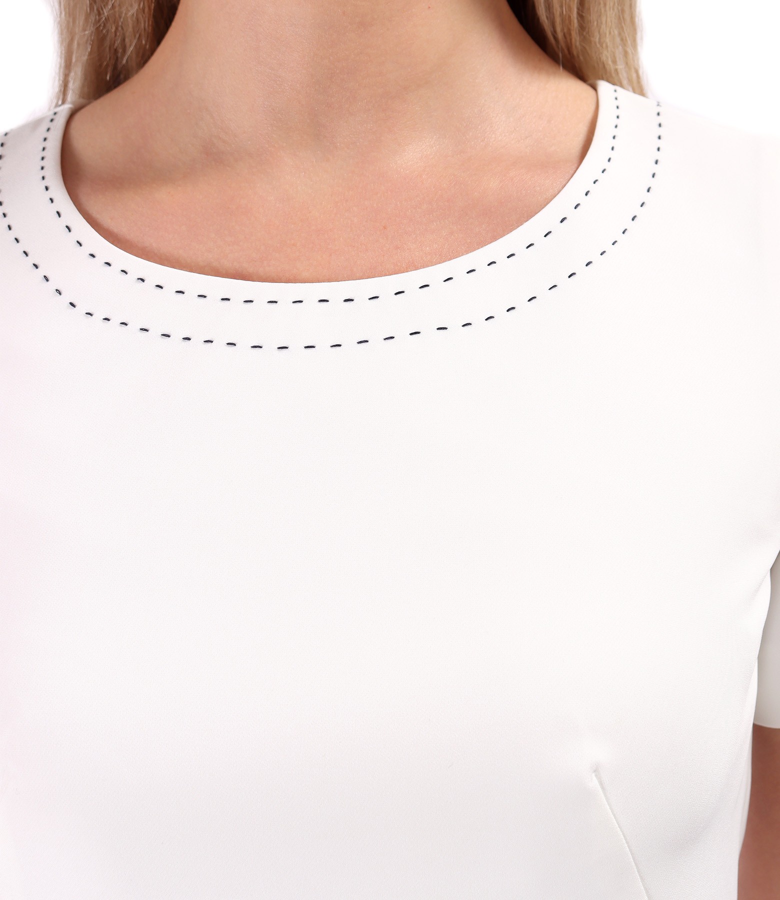 Rochie office made of elastic fabric, A-shaped, lined, round neckline with contrasting decorative stitching. Closes with a zipper on the back.