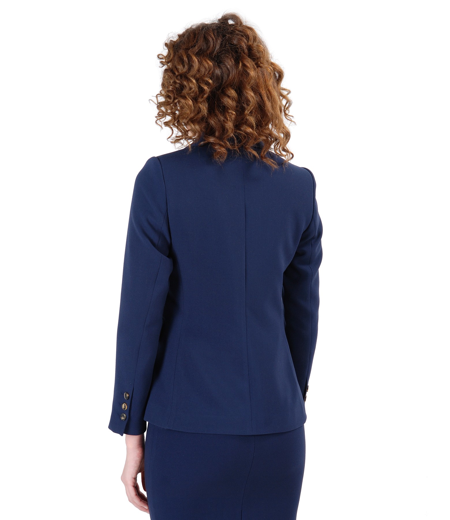 Office jacket made of elastic fabric, padded, with collar and flaps, embellished with crystals from on the collar. Closes with 3 front buttons.