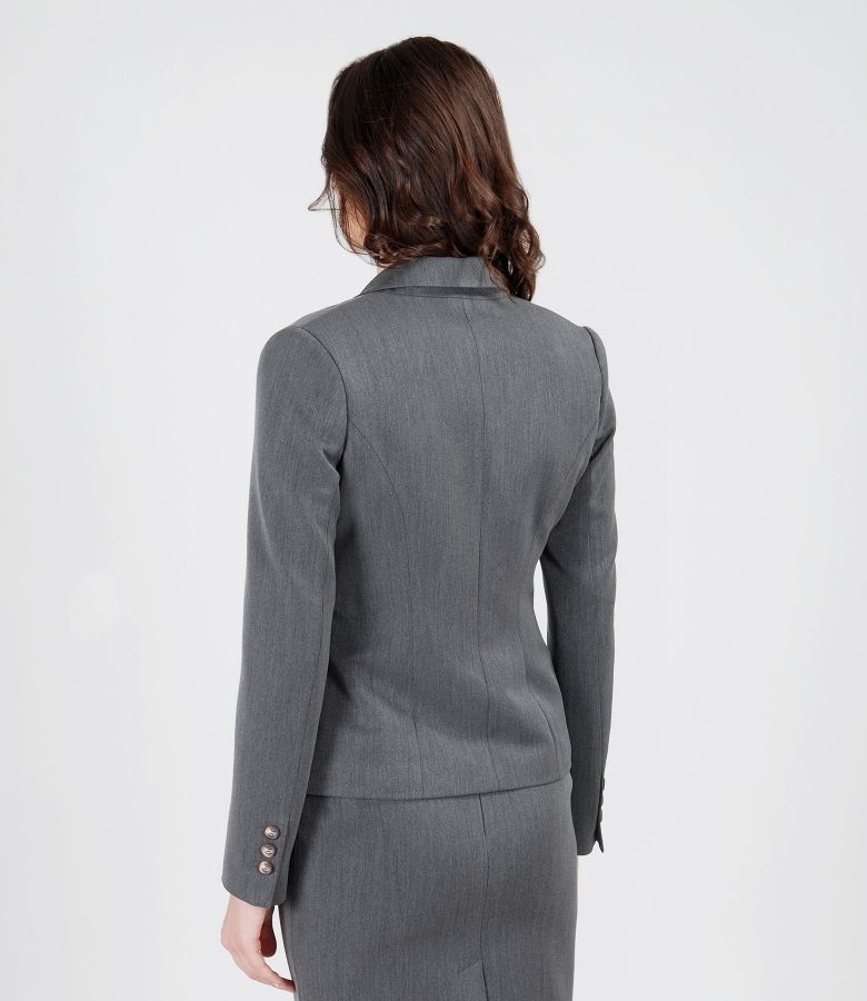 Elastic fabric jacket with deep neckline, fake side pockets on front and long sleeves with fake slit closed with 3 buttons. Closes with one button on front.