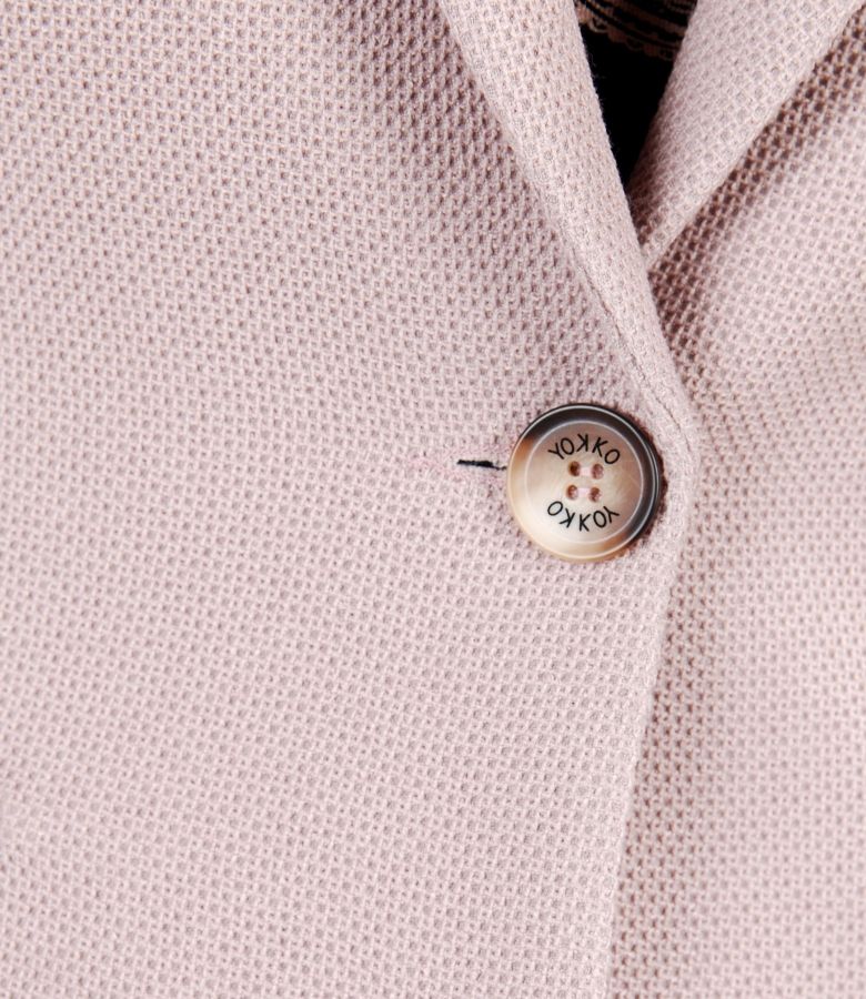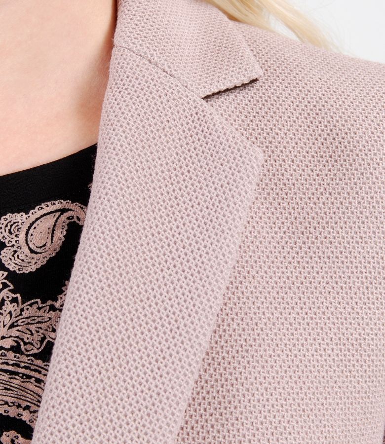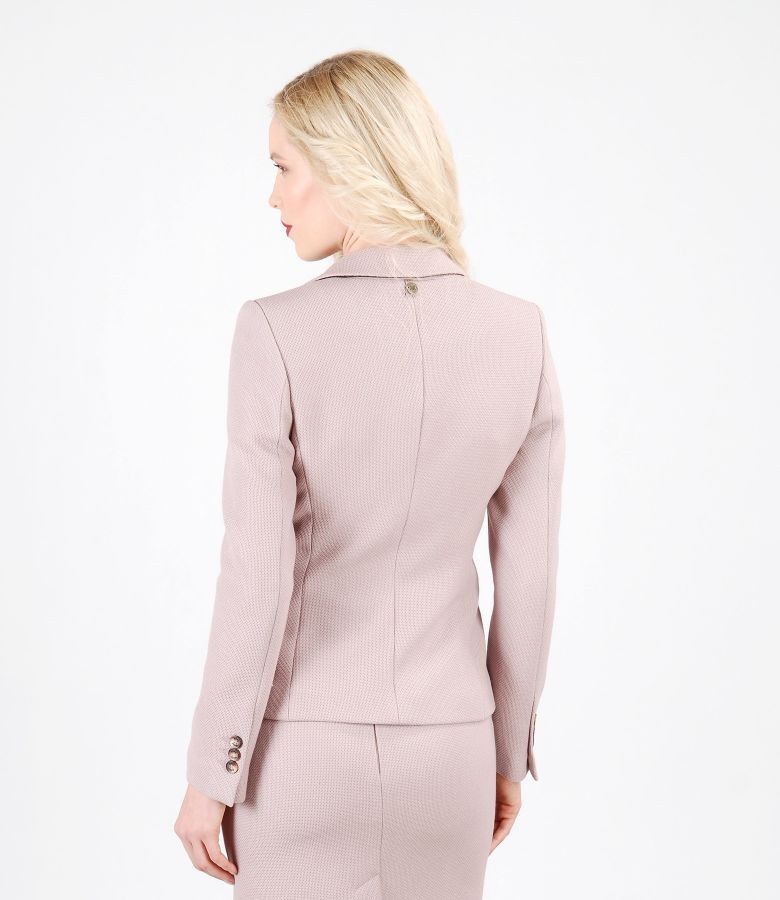 Office jacket from textured elastic fabric with deep neckline and long sleeves, with fake slit closed with 3 buttons and pockets in waist. Closes with one button on front.