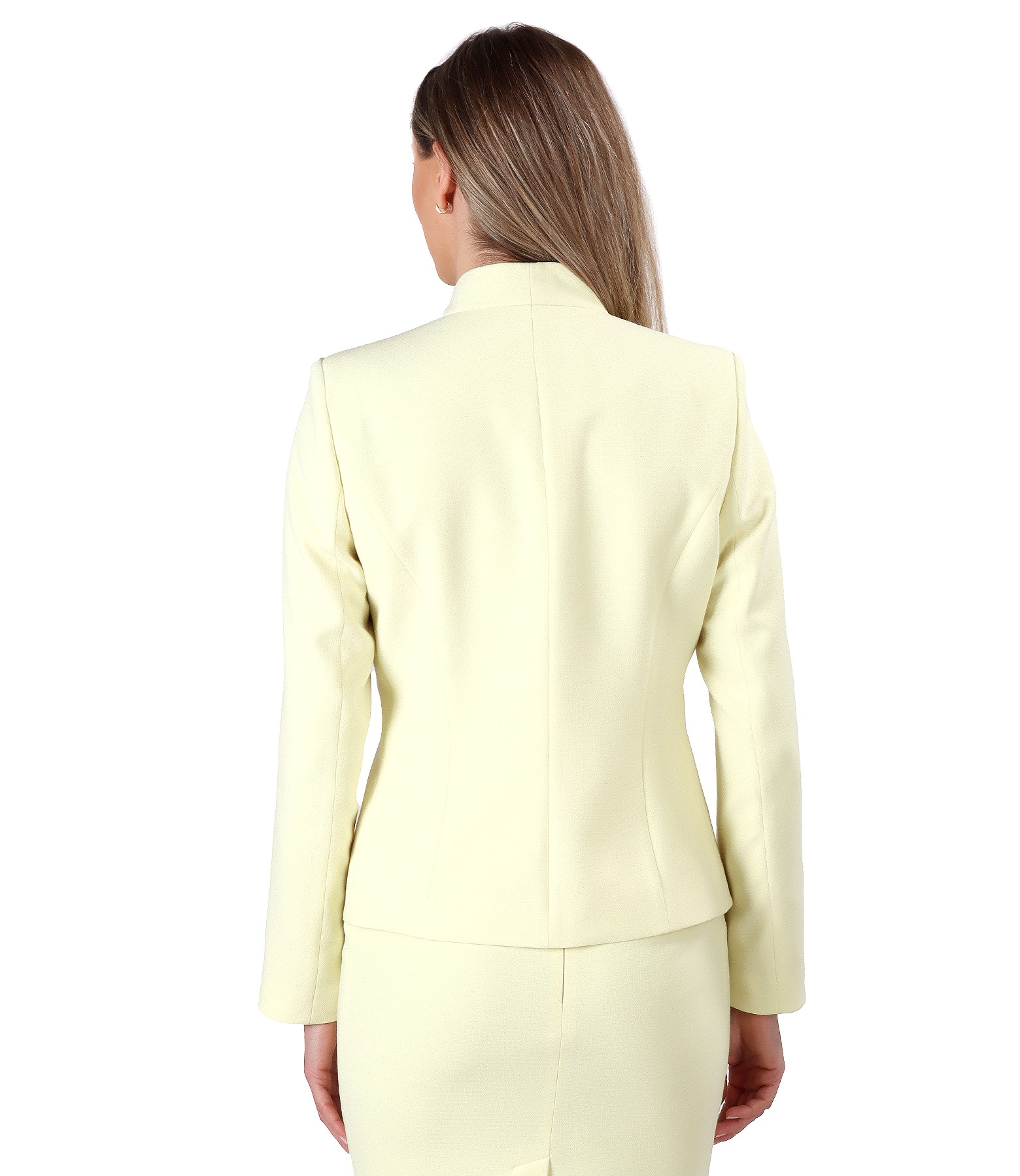 Office jacket made of elastic fabric, padded, with collar like tunic. It closes with a button on the middle of the face.