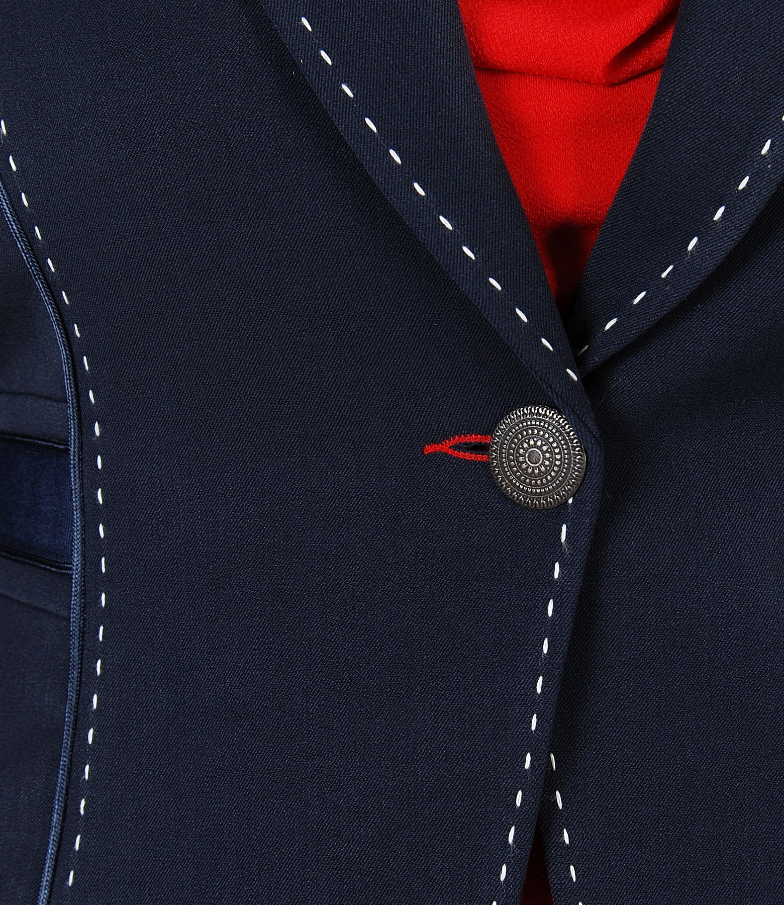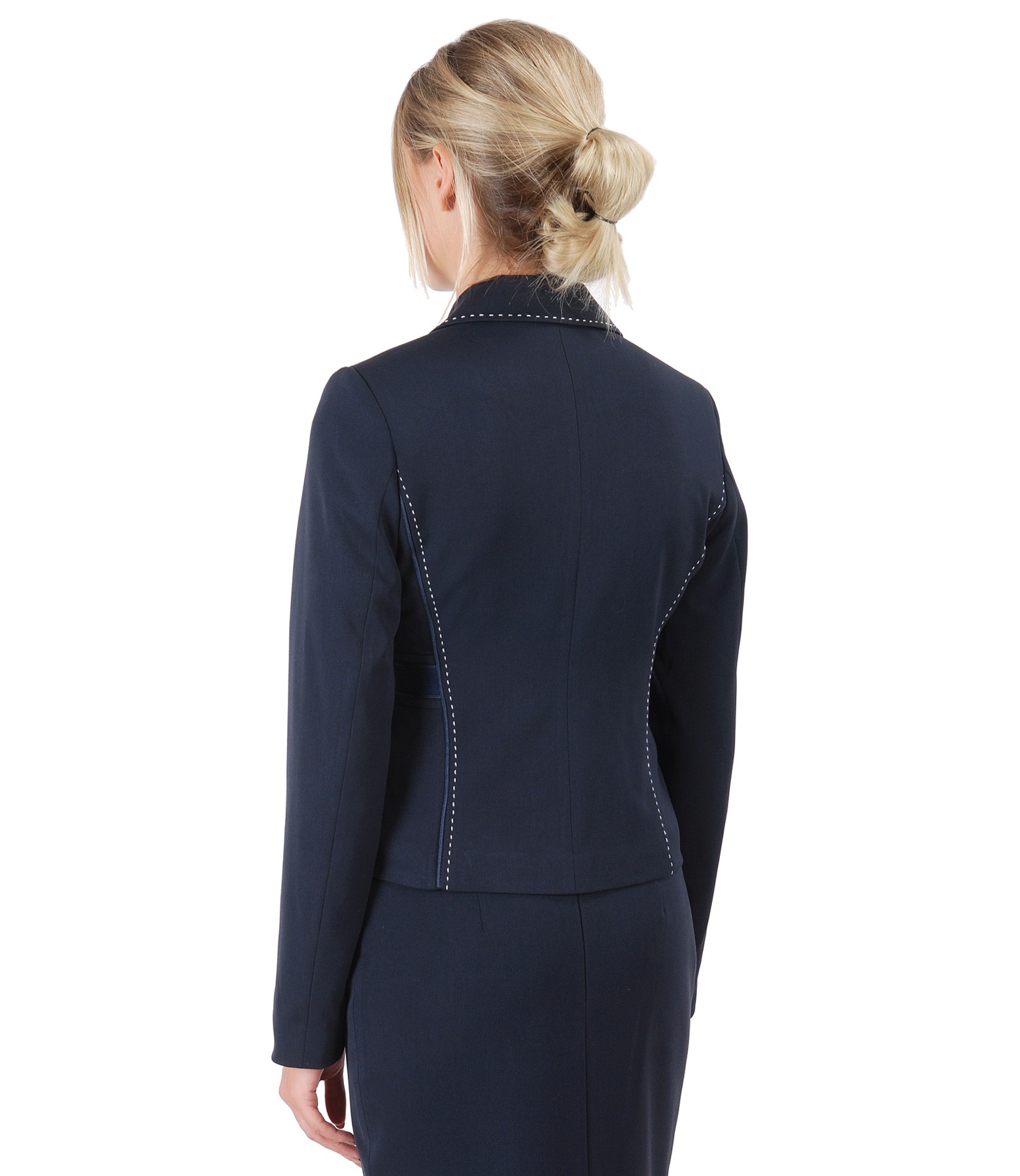 Office jacket made of elastic fabric, padded, with deep low-cut neck, rips band on the side and front and back seam. Closes with a front button.