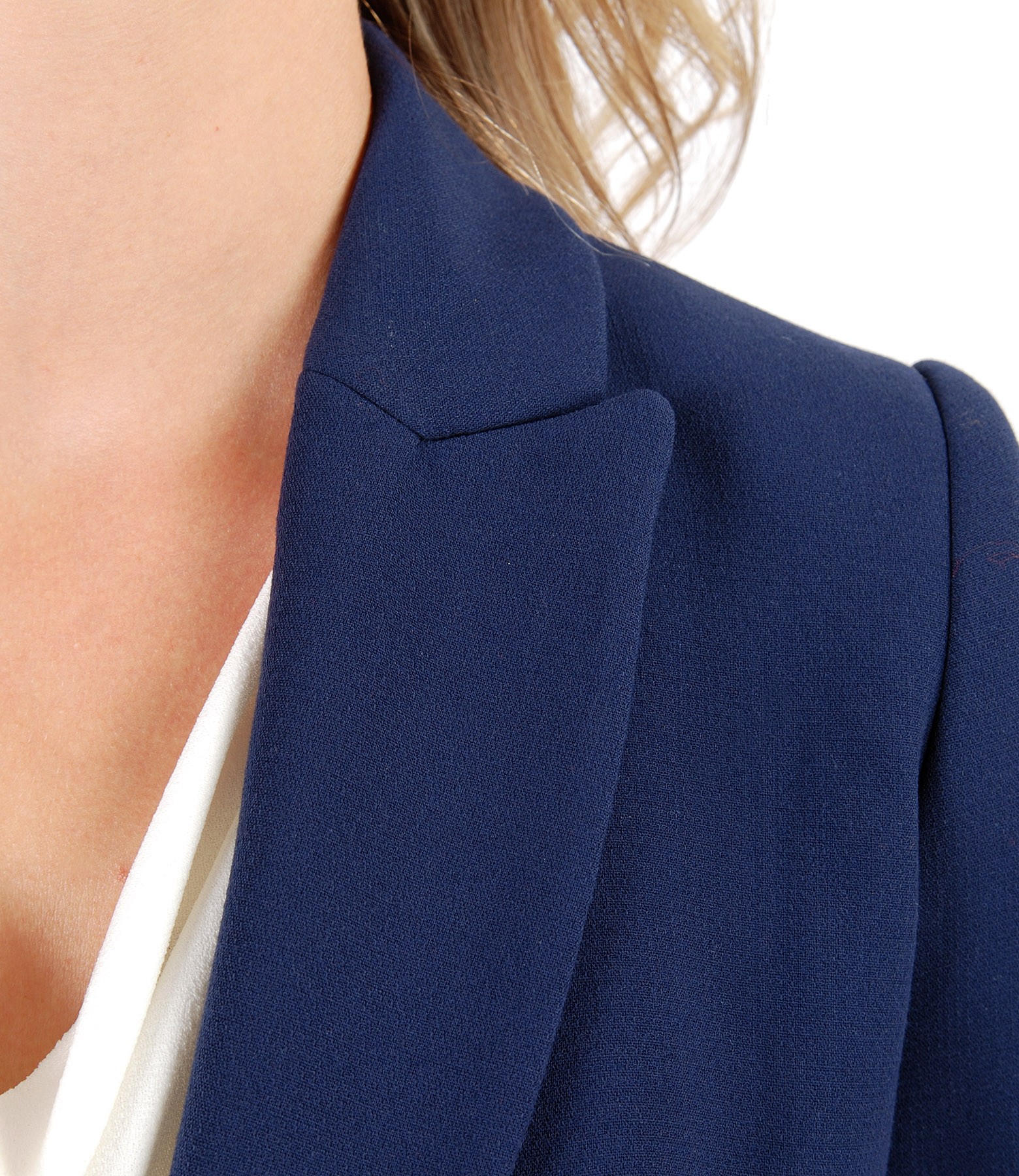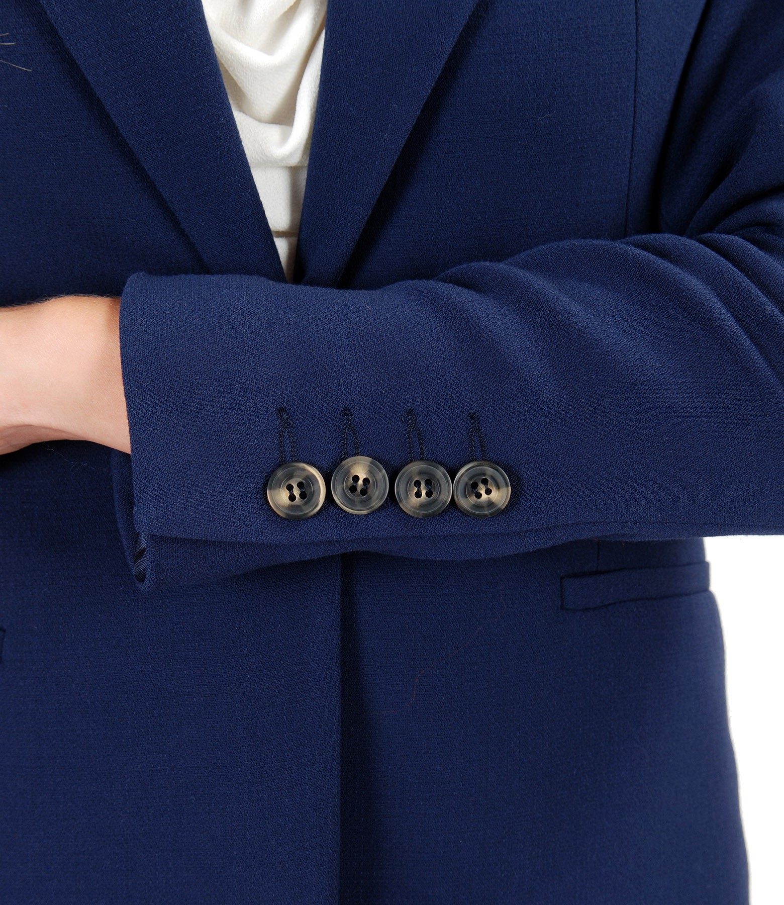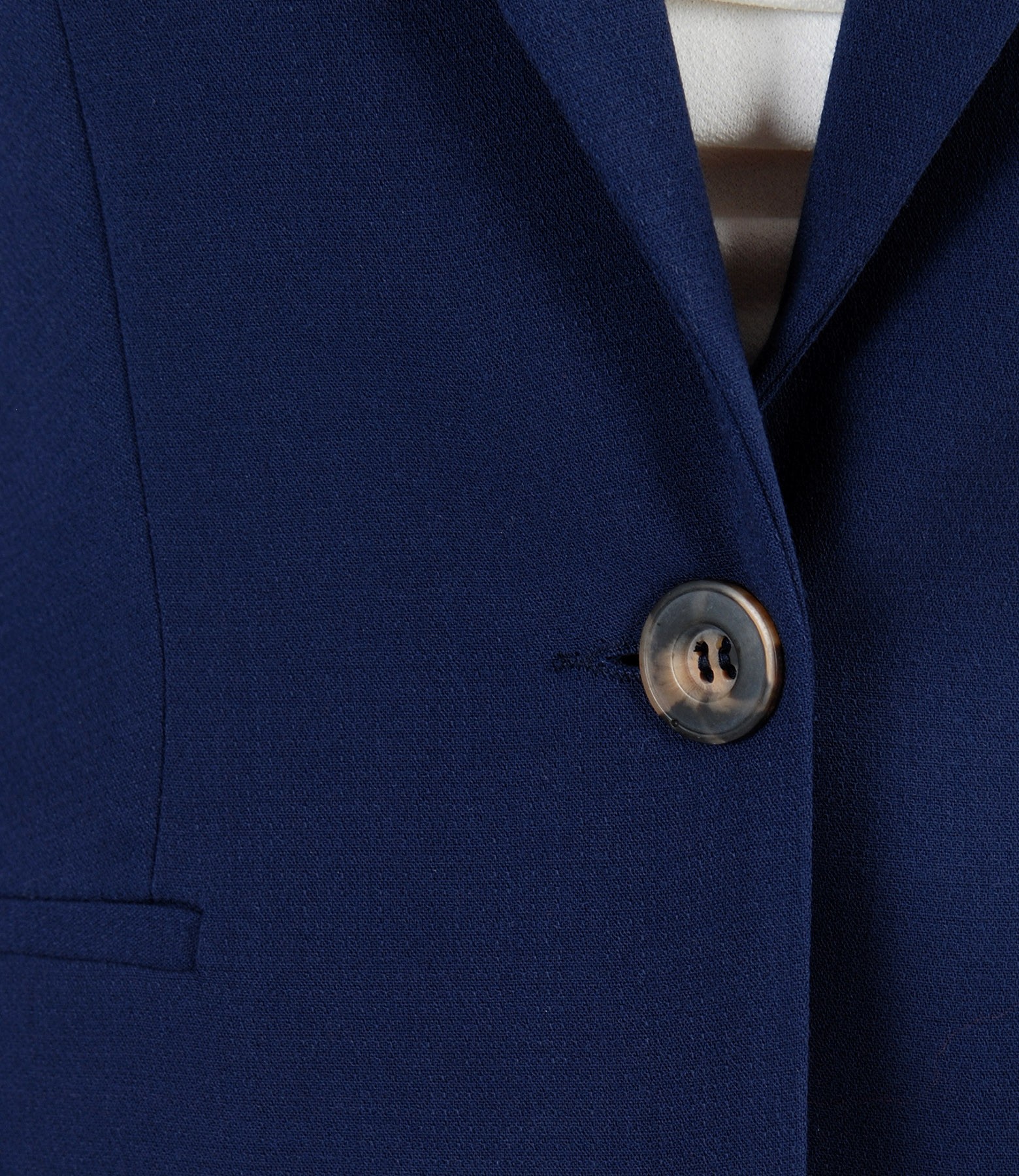 Office jacket made of elastic fabric, padded, with deep low-cut neck, front side pockets, long sleeves with 4 buttons. Closes with a front button.