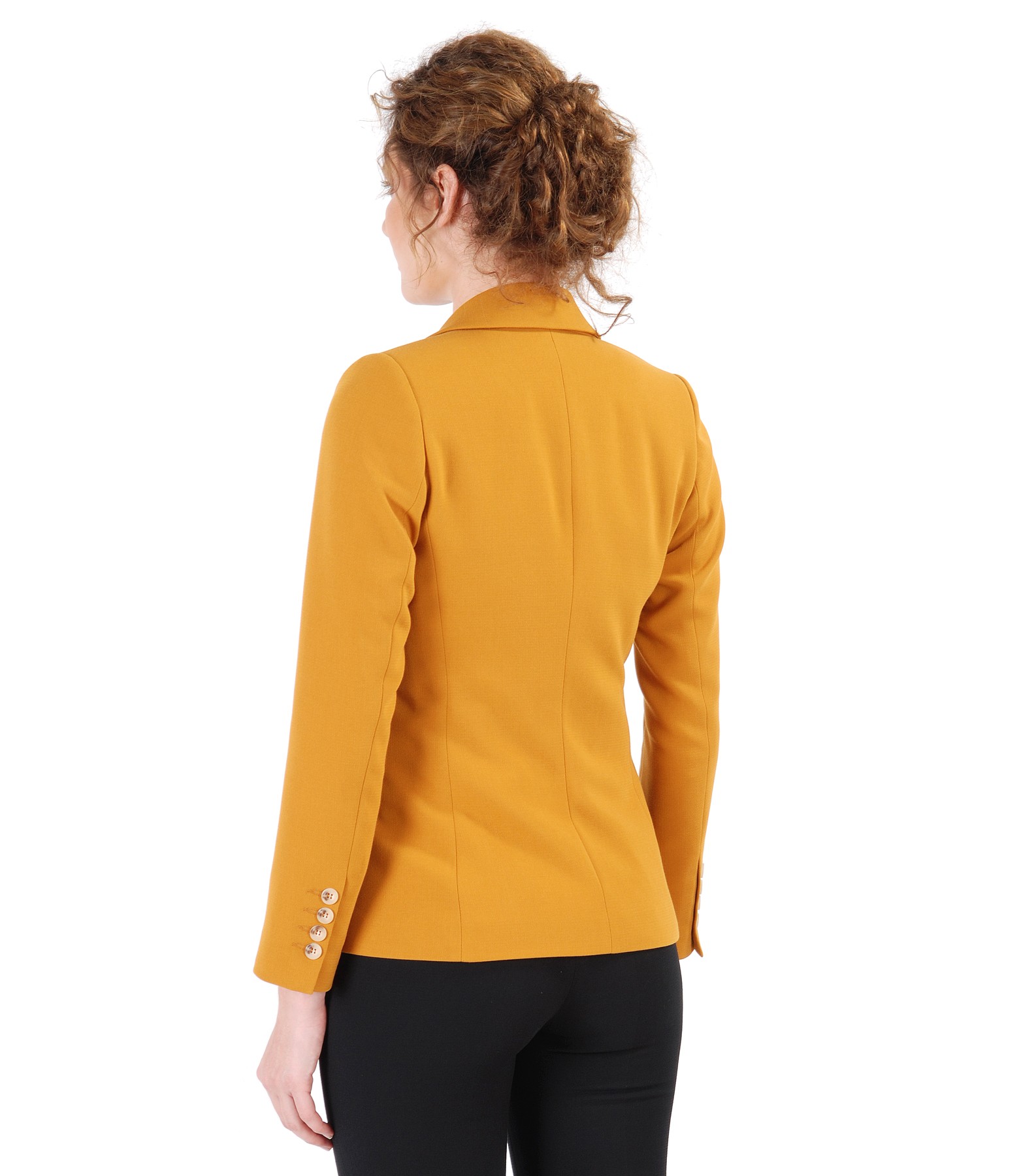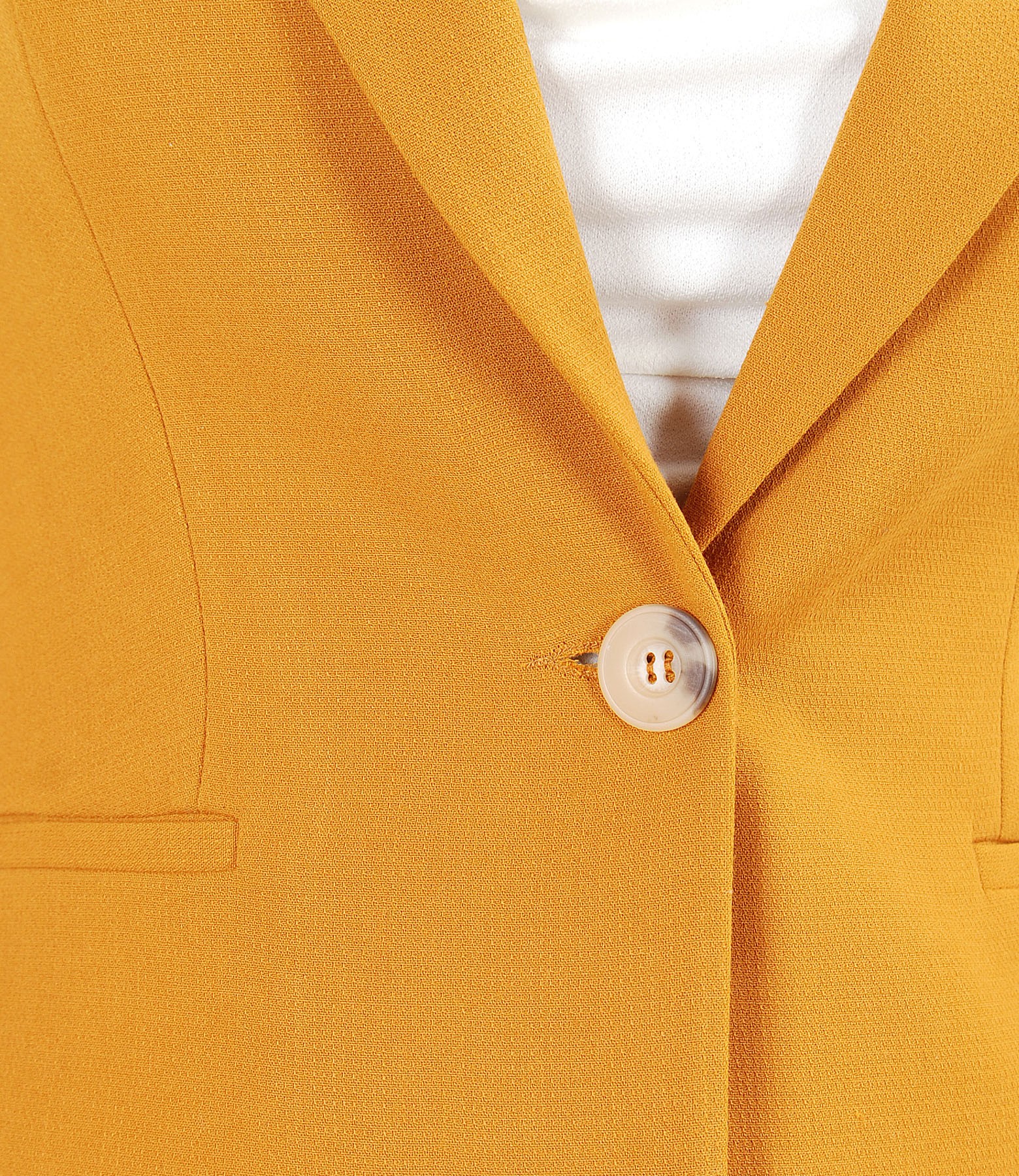 Office jacket made of elastic fabric, padded, with deep low-cut neck, front side pockets, long sleeves with 4 buttons. Closes with a front button.
