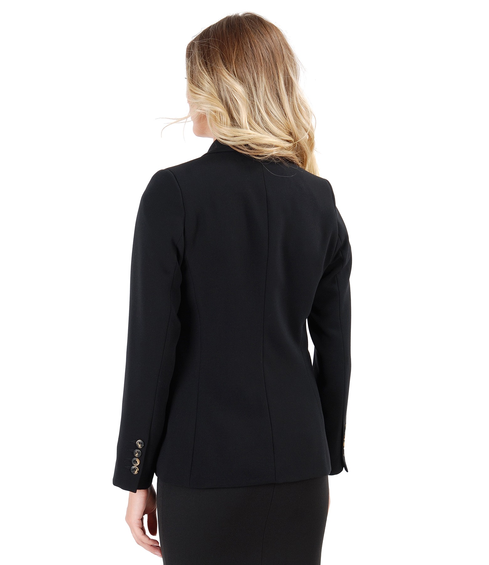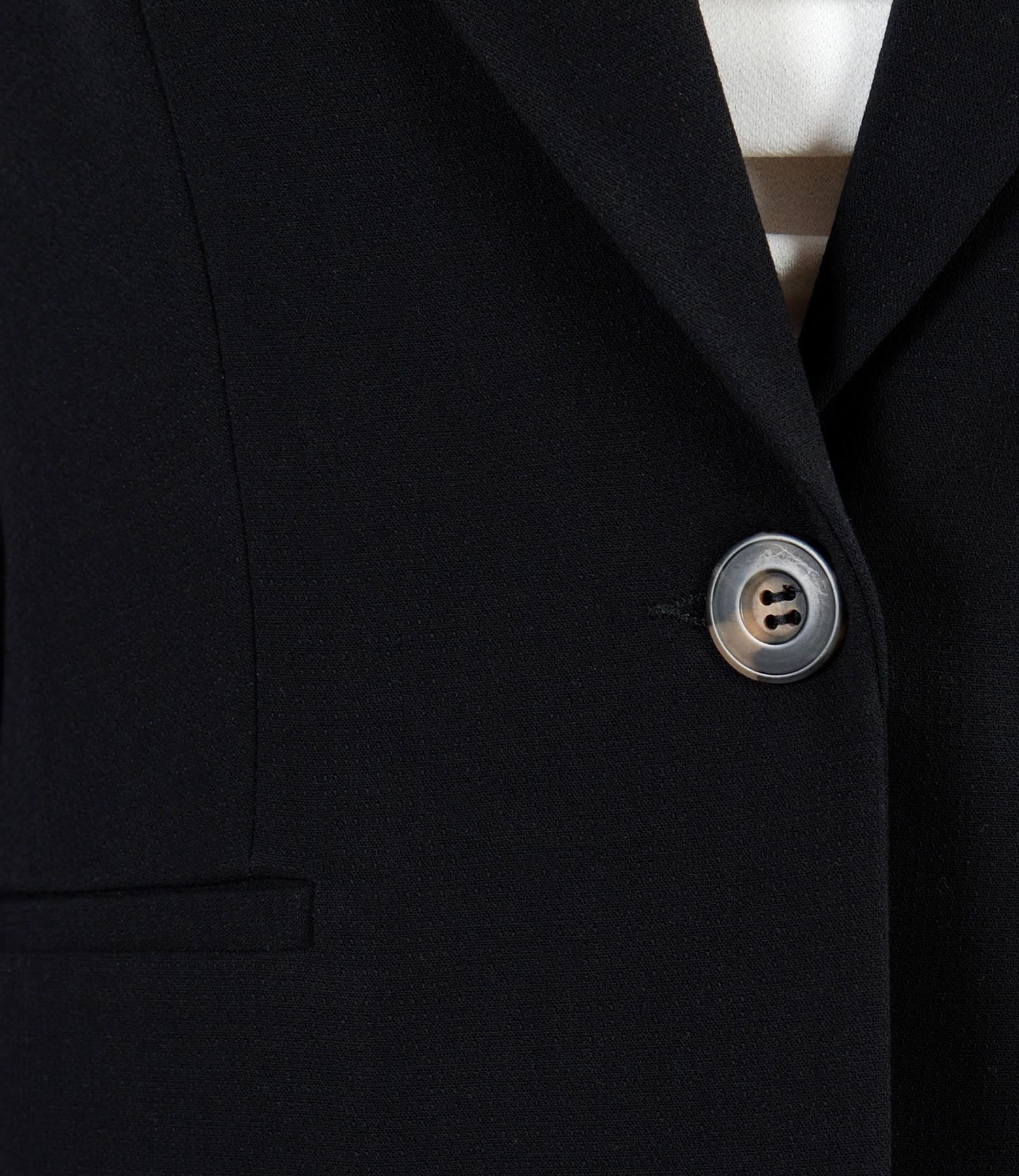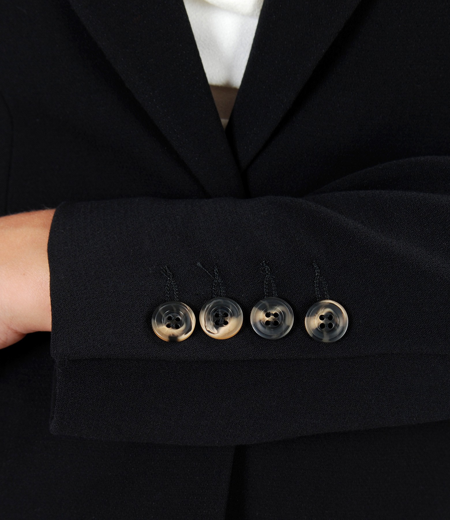 Office jacket made of elastic fabric, padded, with deep low-cut neck, front side pockets, long sleeves with 4 buttons. Closes with a front button.
