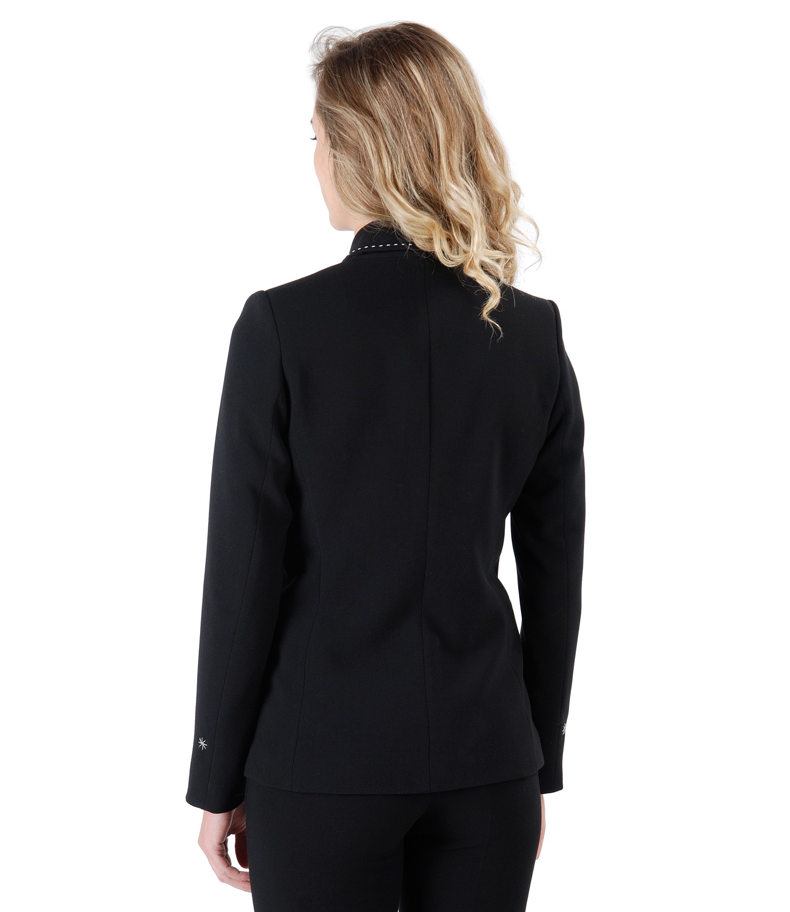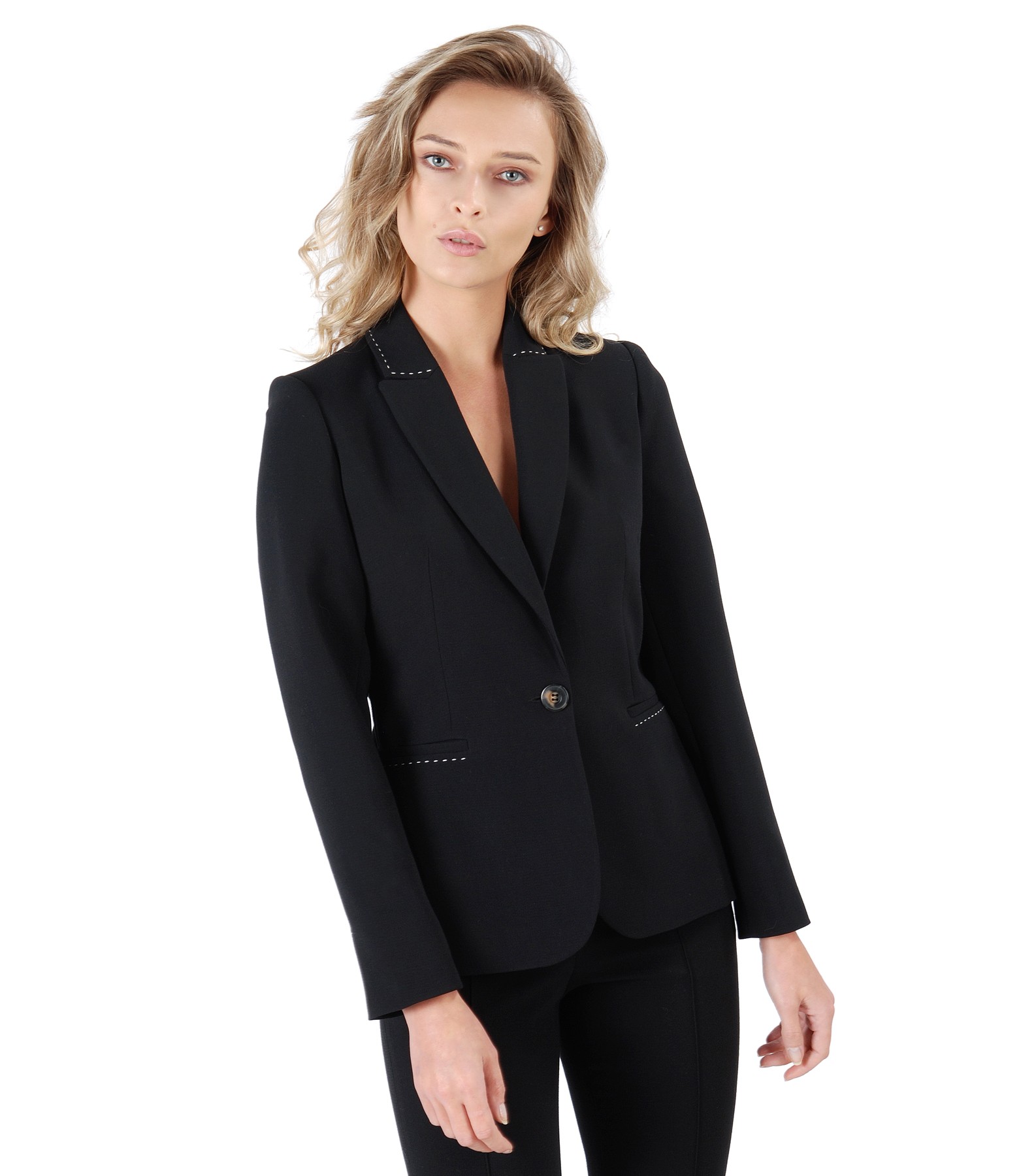 Office jacket made of elastic fabric, padded, with deep low-cut neck, front side pockets and decorative seam on the collar and pockets. Closes with a front button.