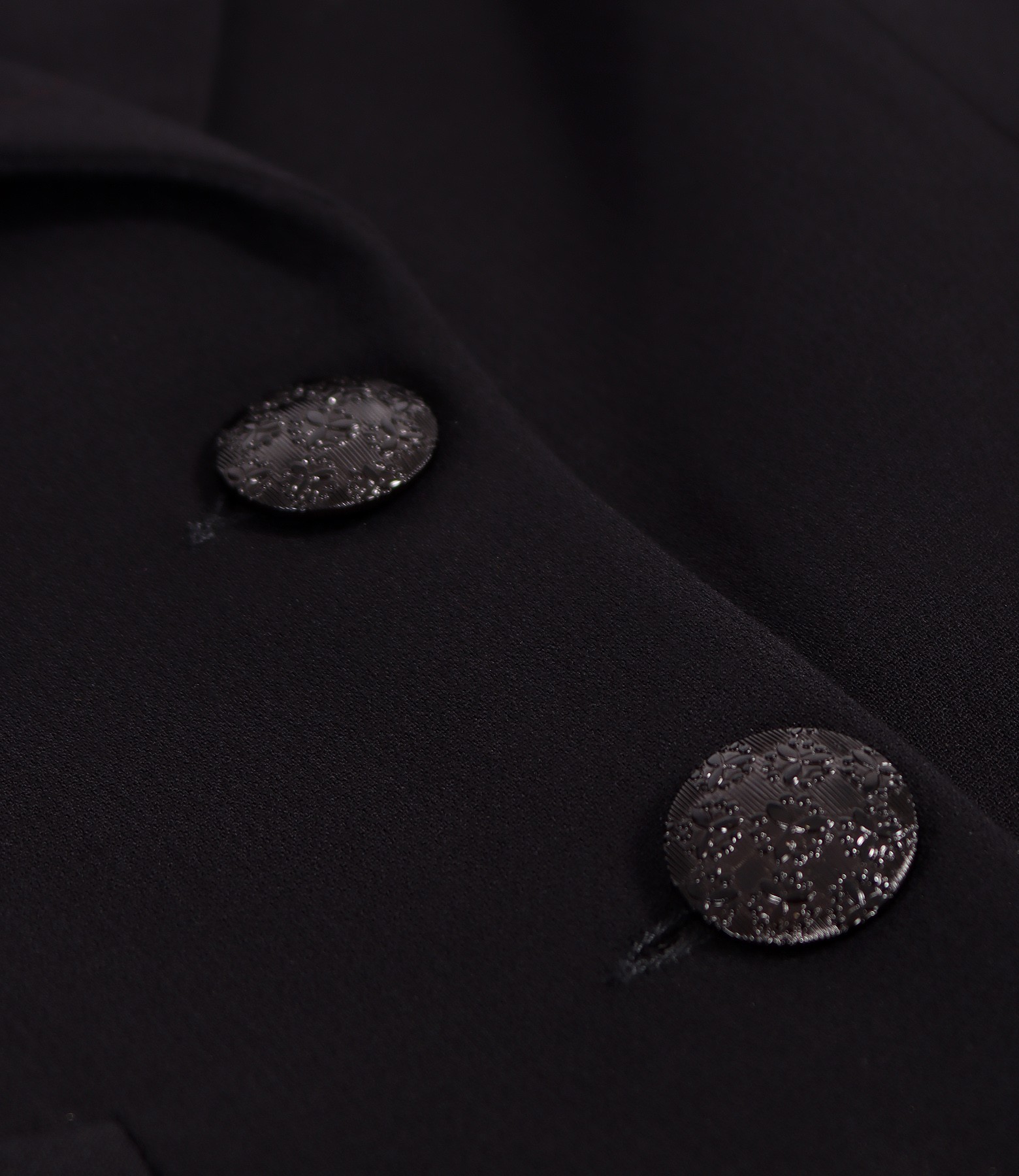 Office jacket made of elastic fabric with viscose, padded, with a deep neckline and with rips with a chain at the hems. It closes with two buttons on the front.