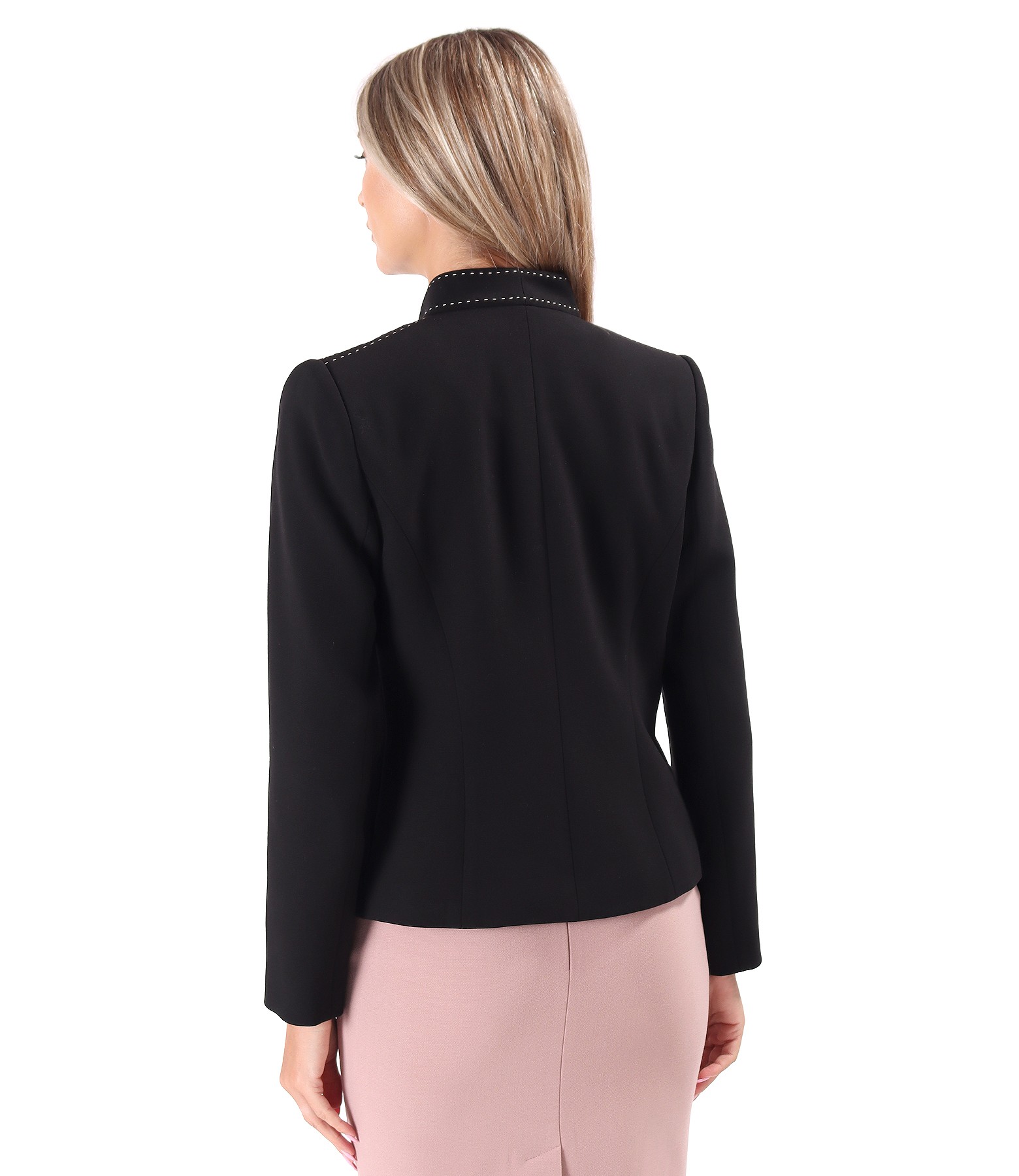 Office jacket made of elastic fabric with viscose, lined, with a tunic collar and decorative stitching in contrast. It closes with a button in the middle of the front.
