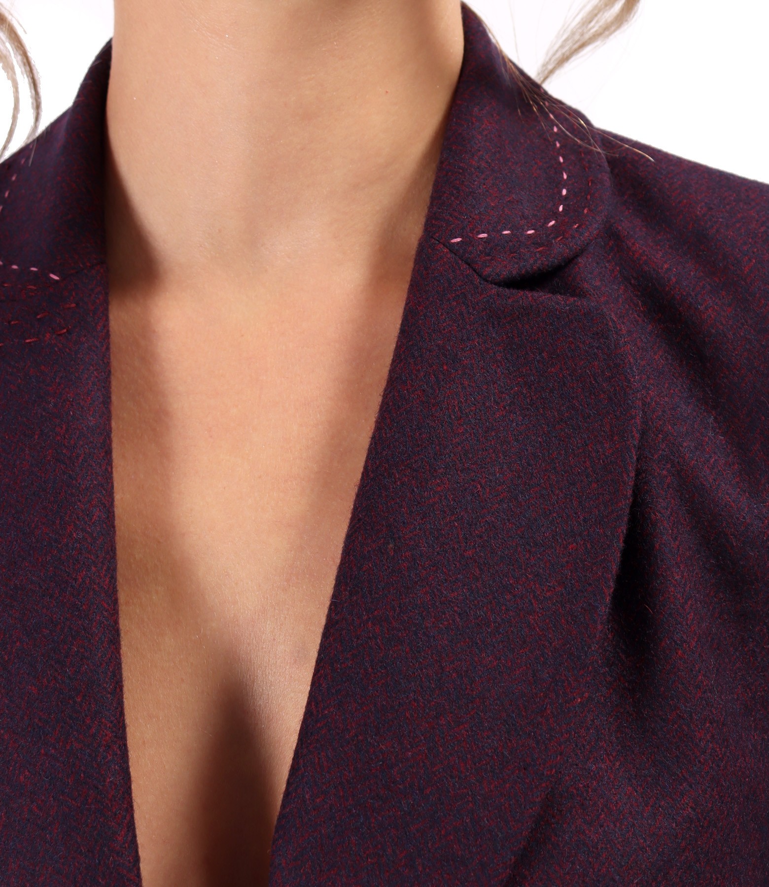 Office jacket made of fabric with wool, lined, with a deep neckline and decorative stitching in contrast. It closes with two buttons on the front.