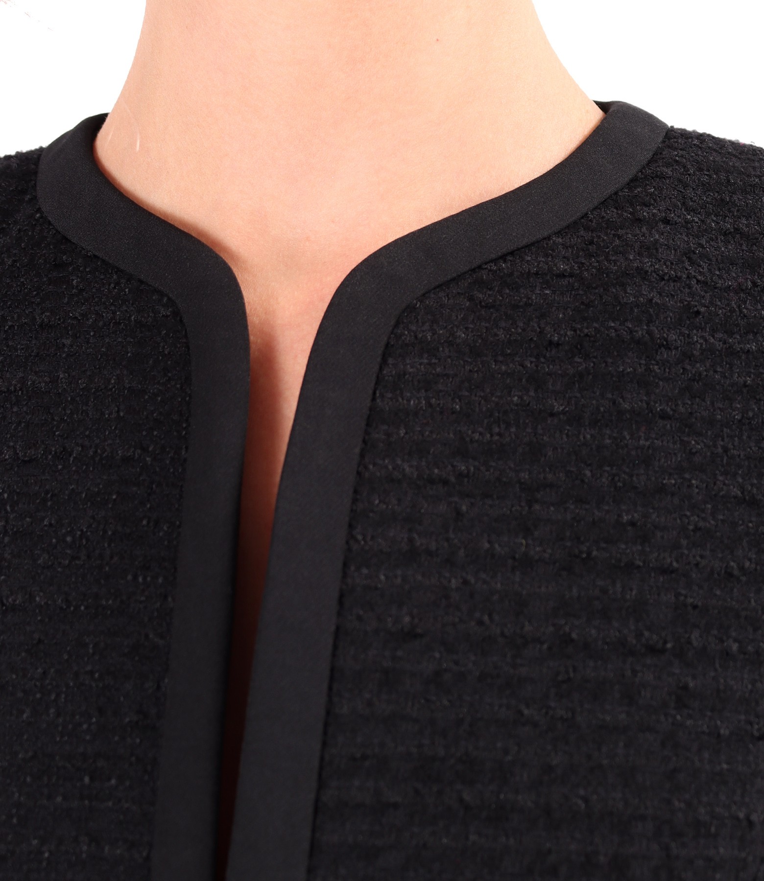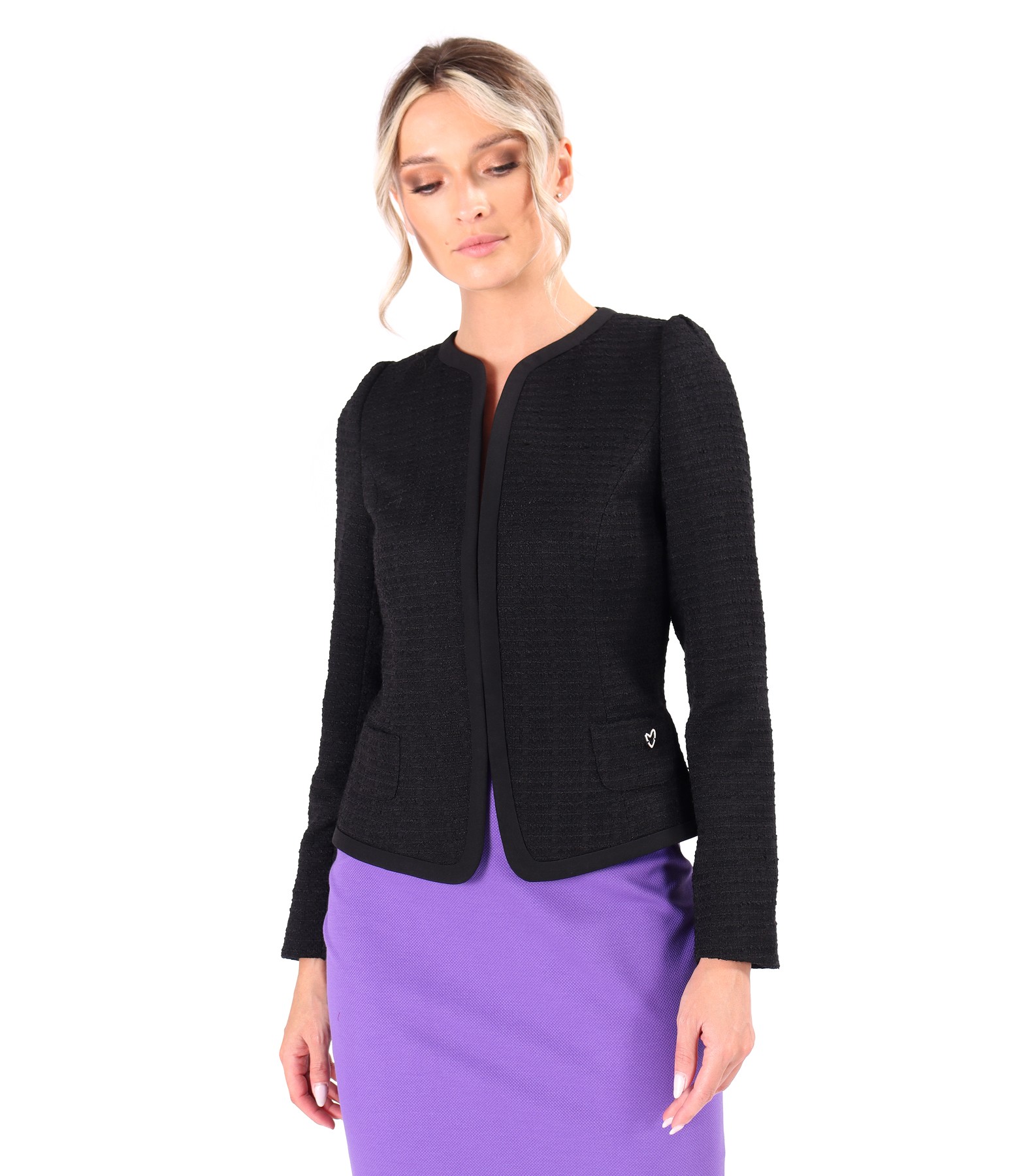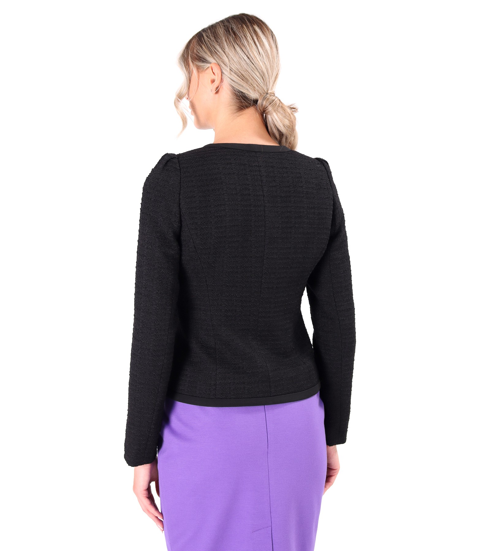 Office jacket made of loops with viscose and cotton, padded, without collar, with trim on the edge, and with pockets with a decorative element on the front. It closes on the front with 4 pairs of staples up to the bust level.