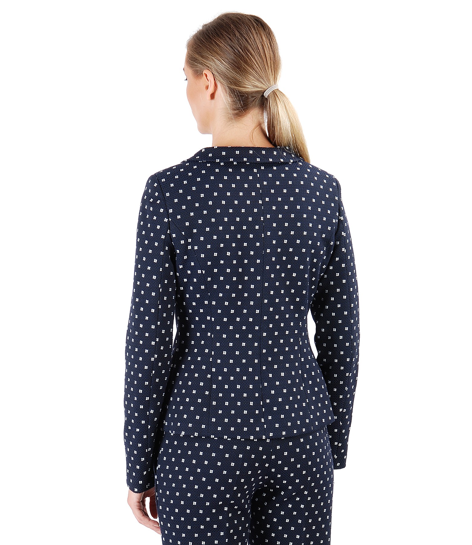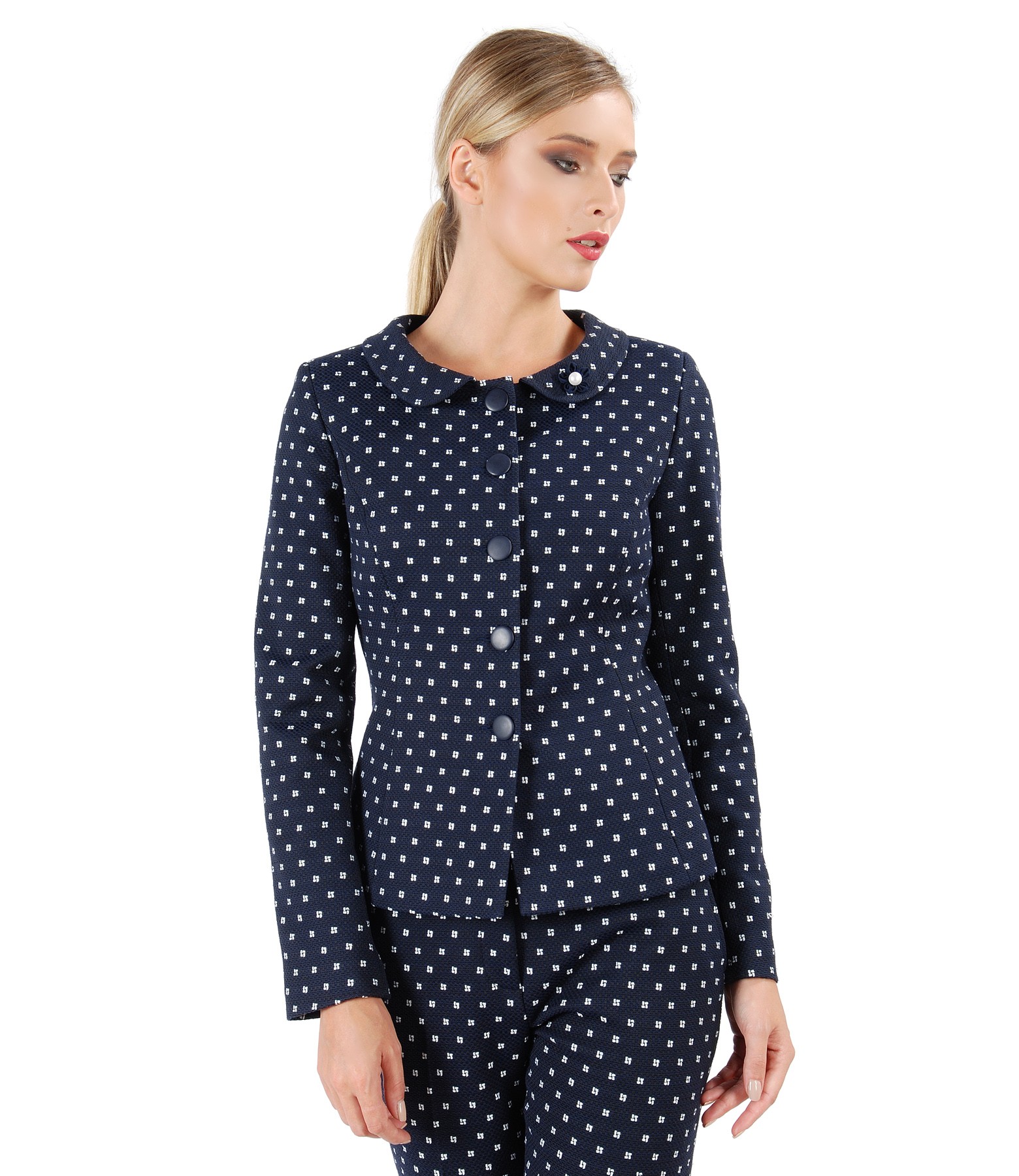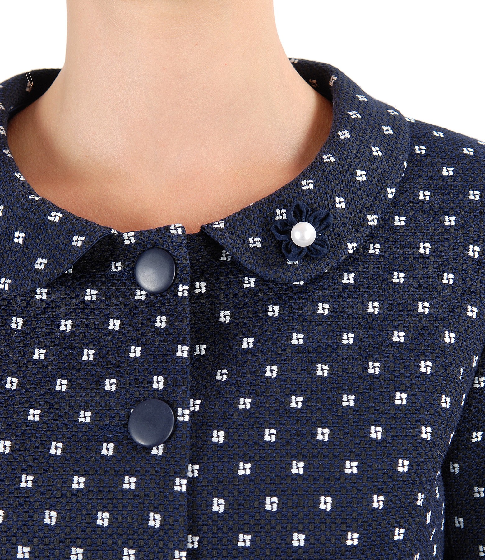 Office jacket made of printed cotton, padded, with round collar and decorative pine on the collar. Closes with 5 buttons.