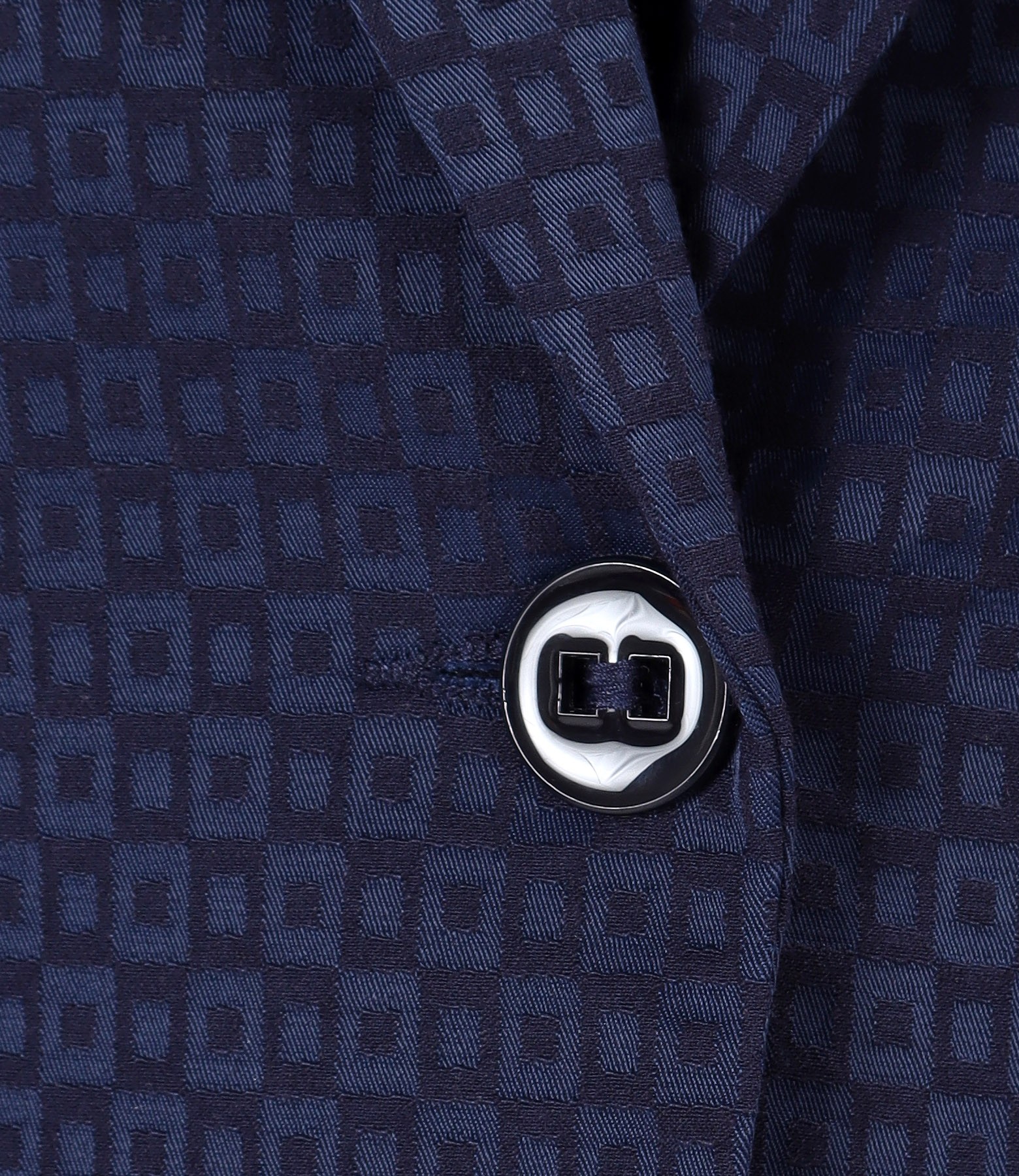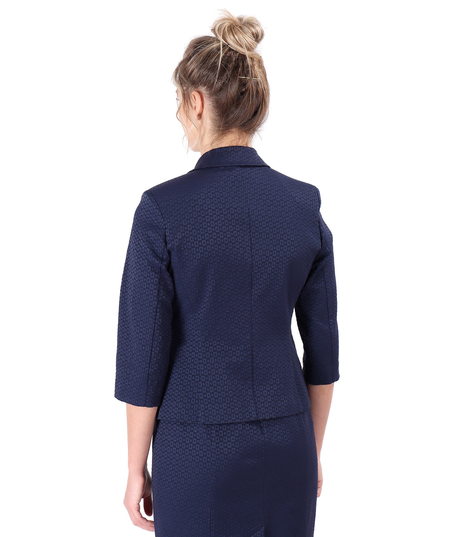 Office jacket,made of textured elastic cotton,unlined,arched with 3/4 sleeves and an decorative pine on the decolletage.Close with an button on the face.