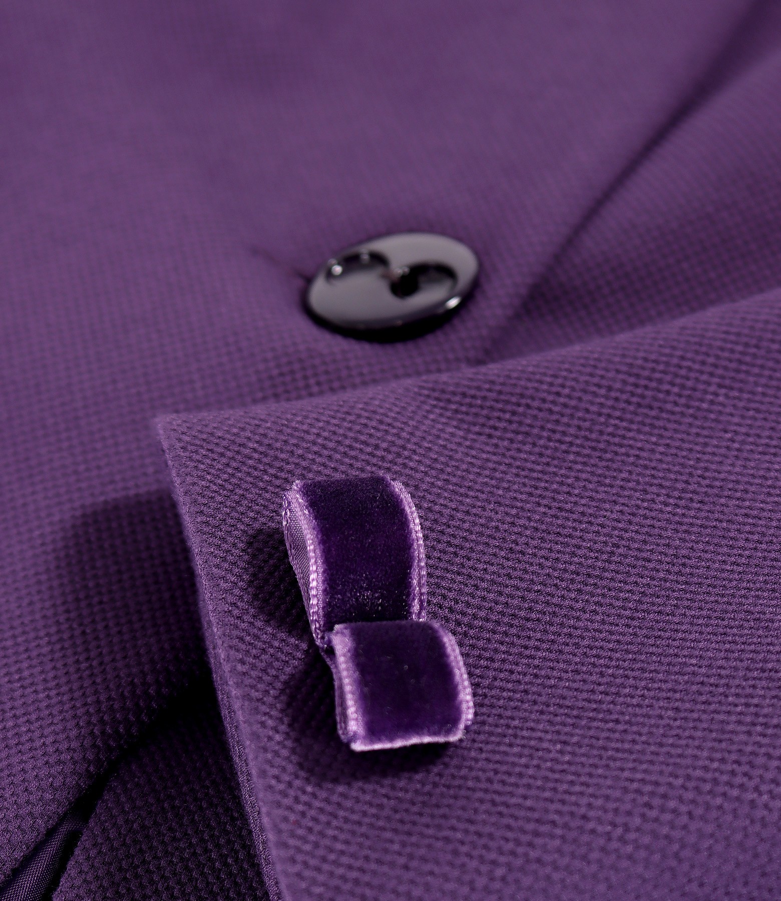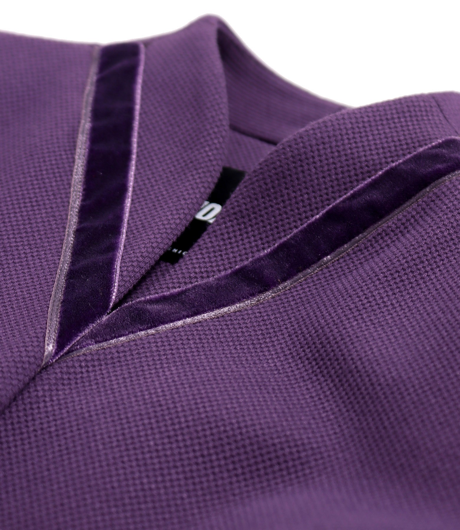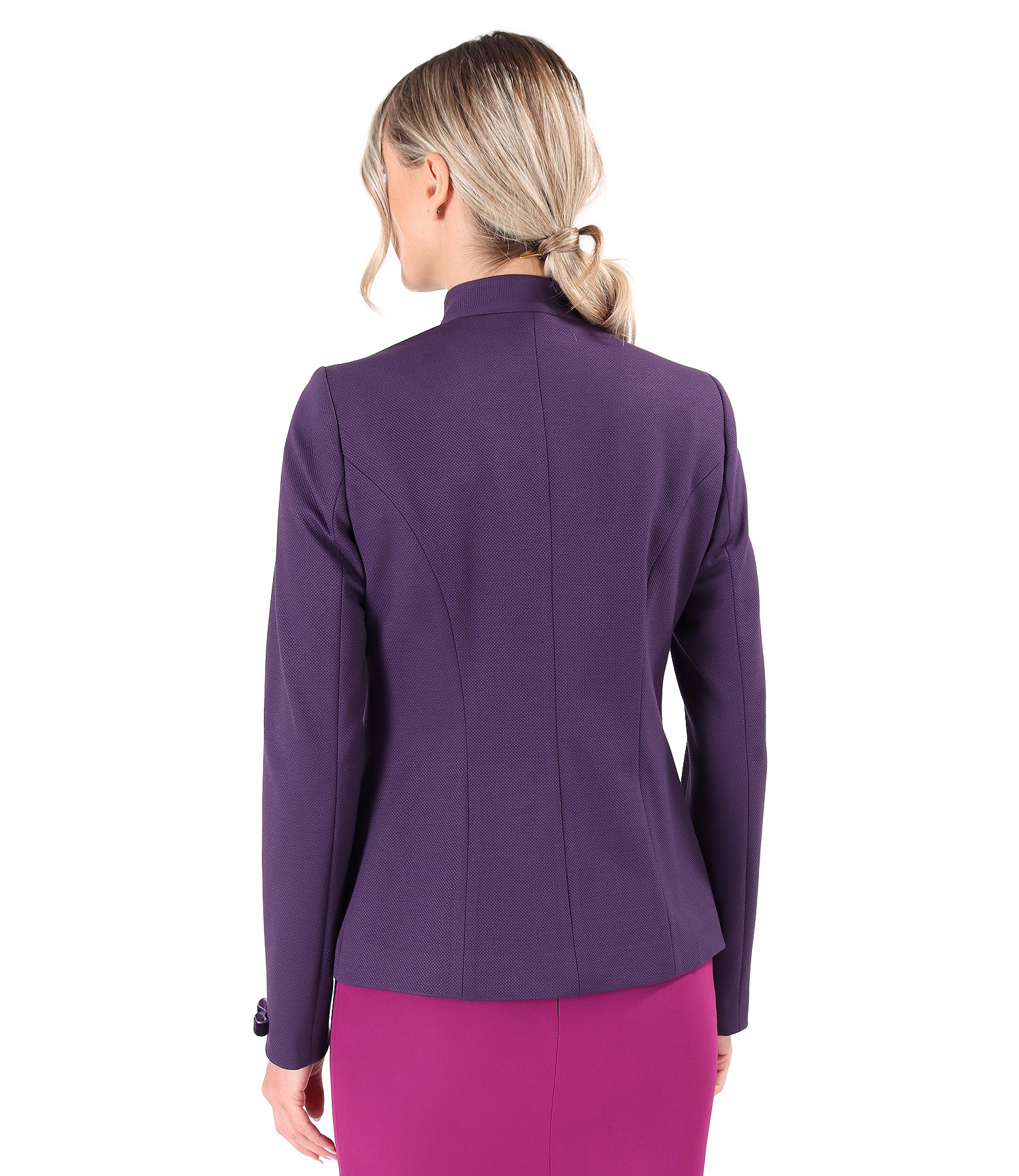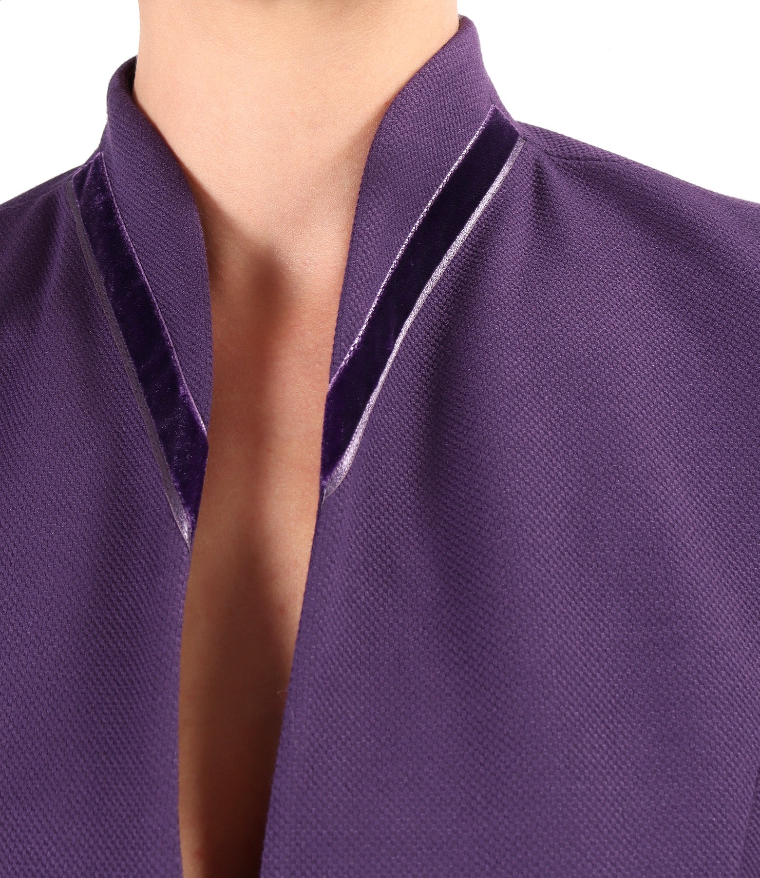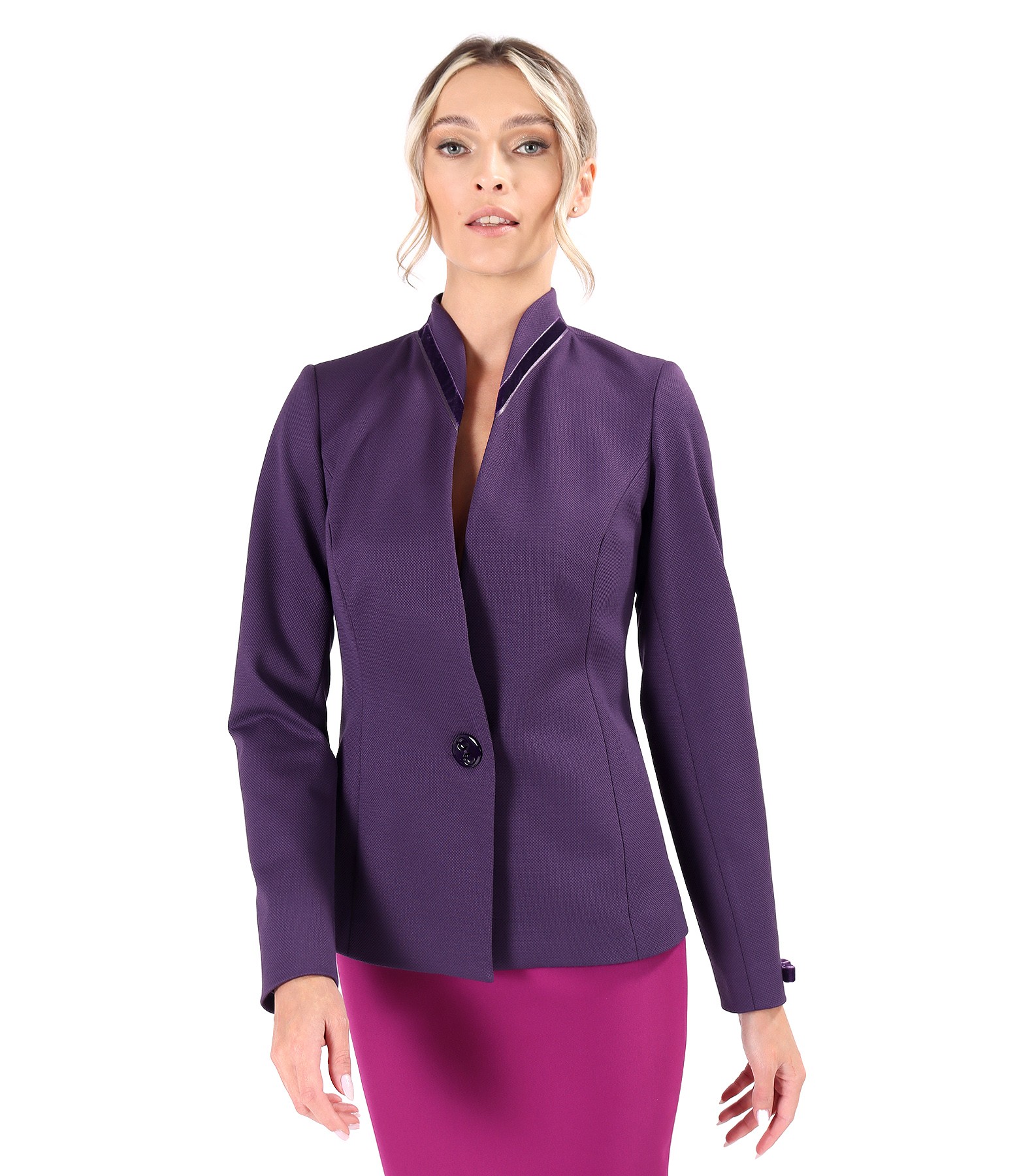 Office jacket made of viscose textured fabric, padded, with tunic-like collar, deep neckline, and velvet lining. It closes with a button in the middle of the front.