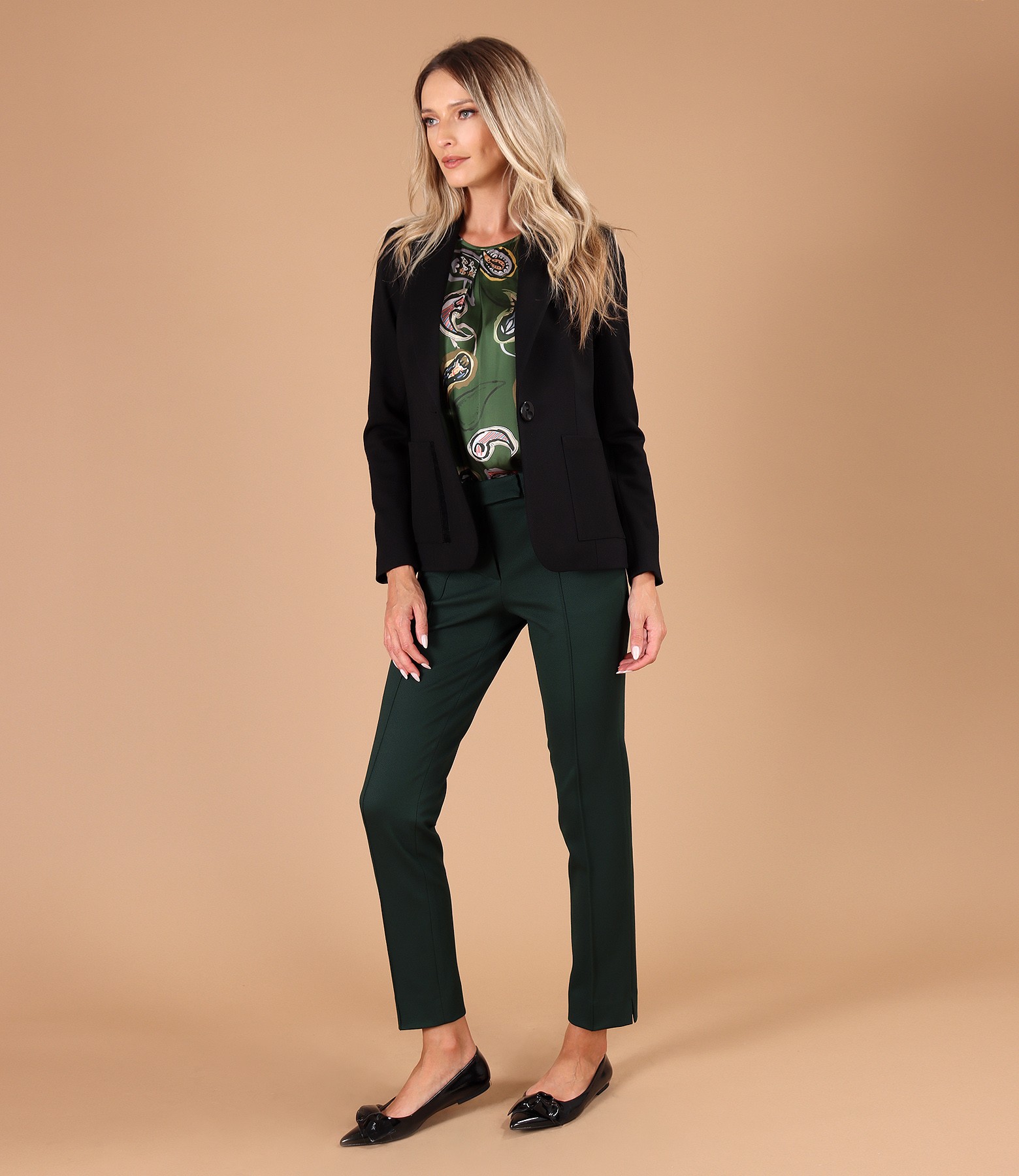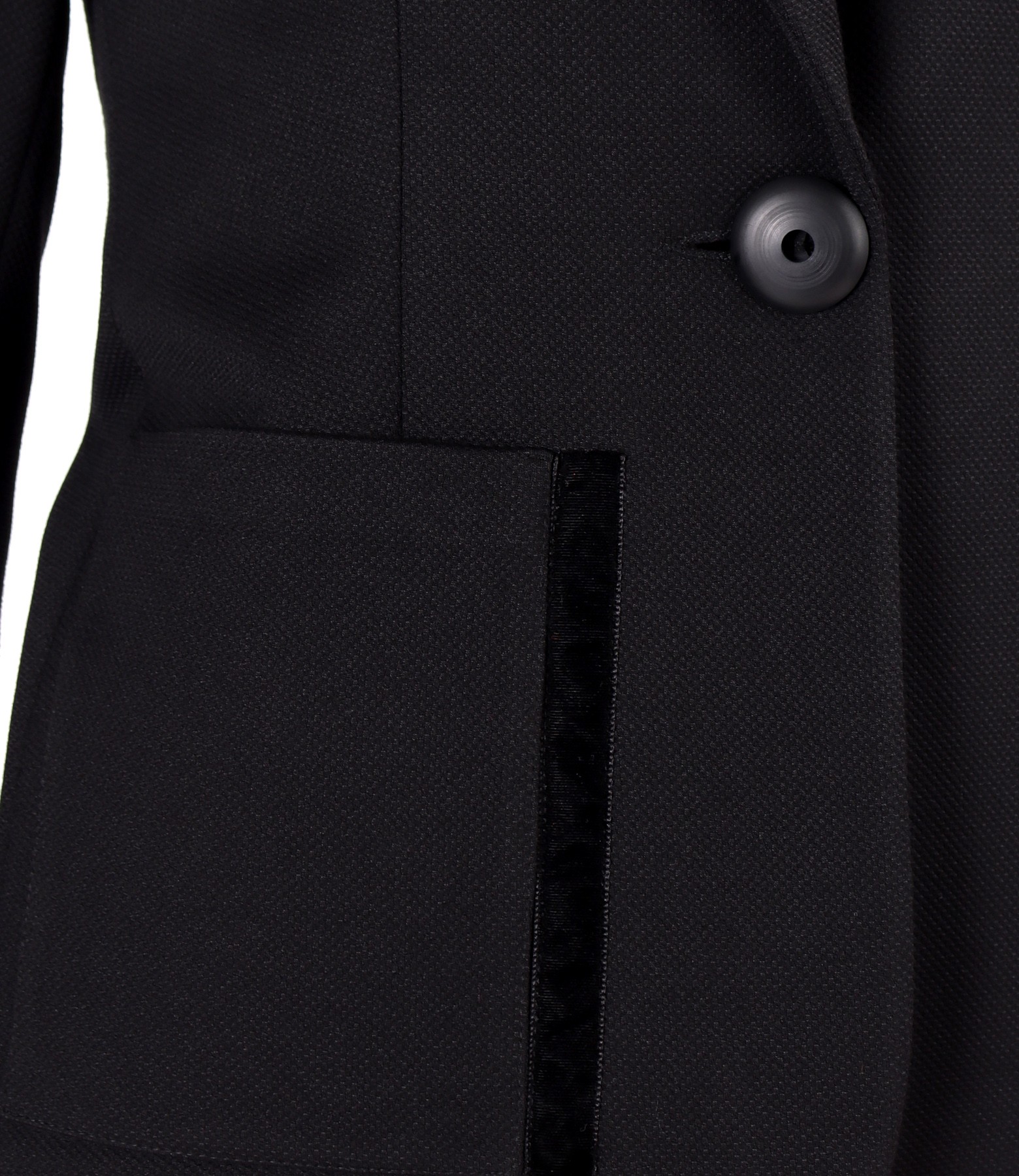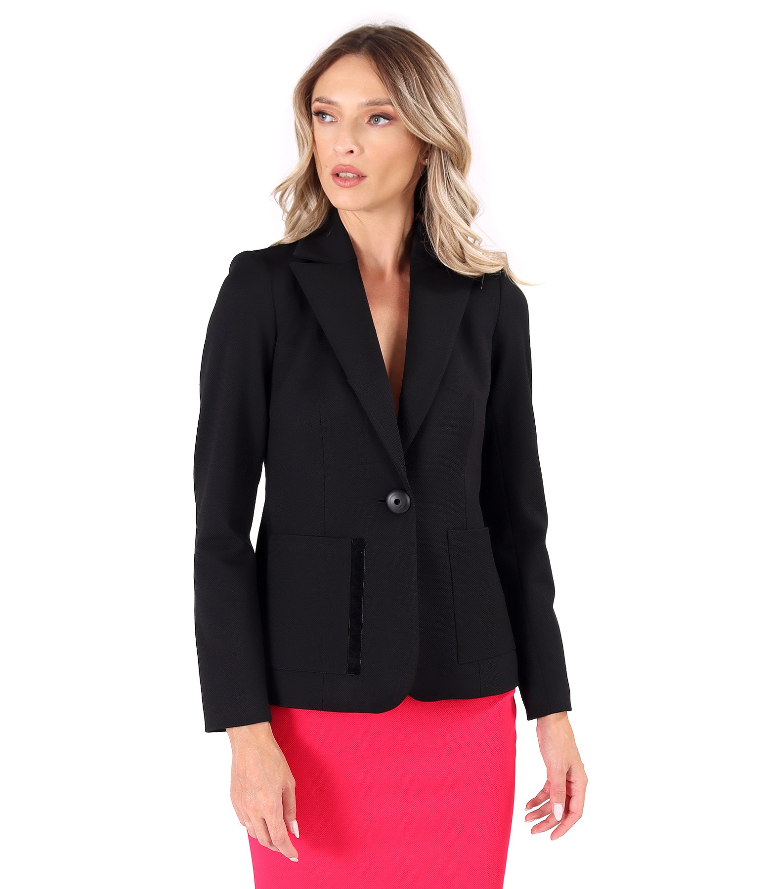 Office jacket made of textured fabric with viscose, padded, with a deep neckline, and with pockets applied on the front and velvet lining. It closes with a button on the front.