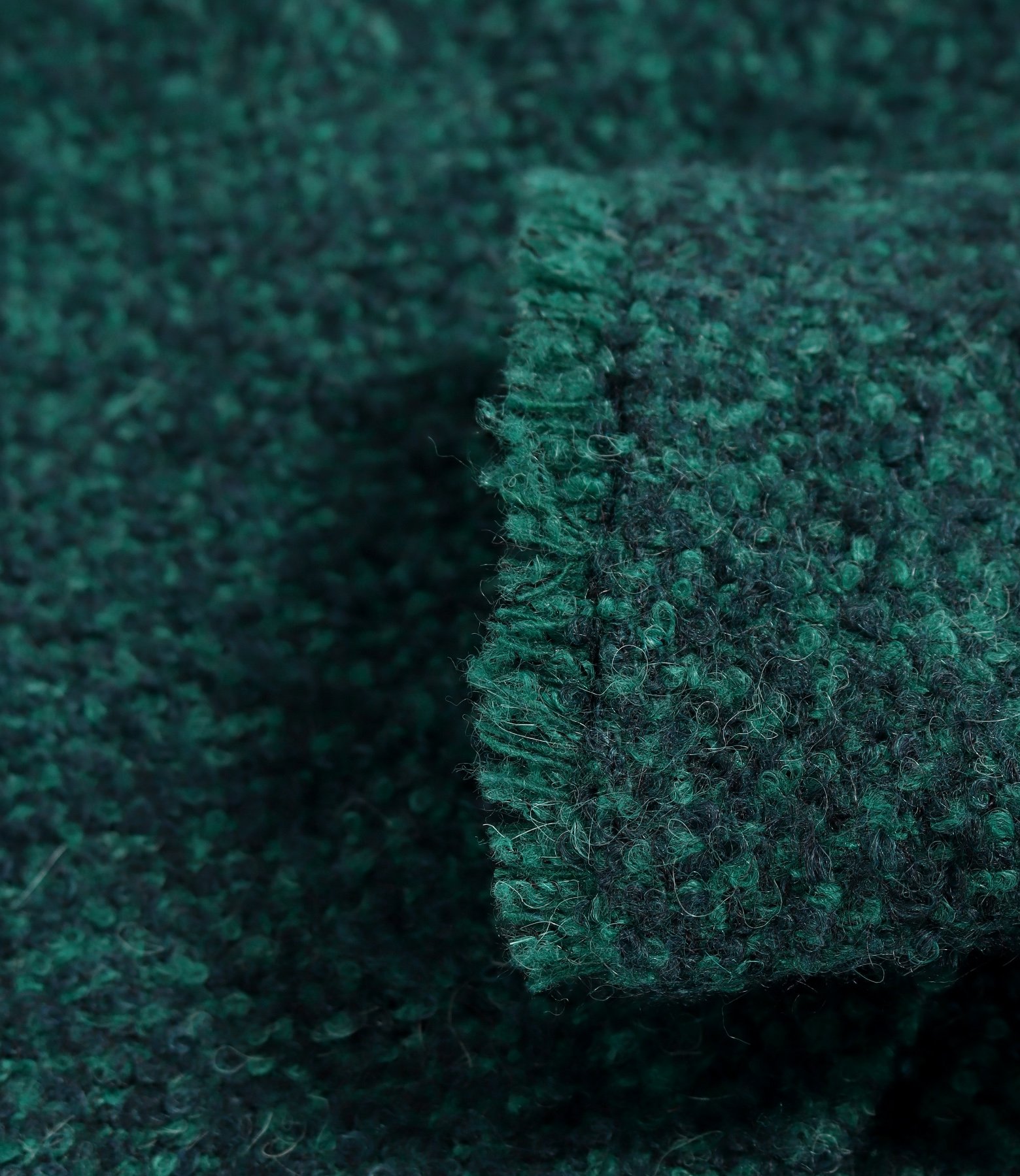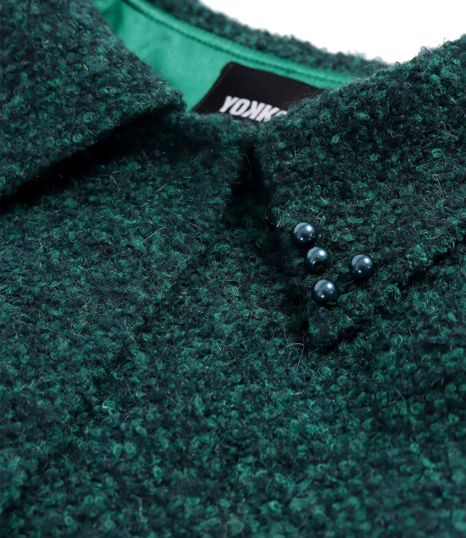 Office jacket made of wool and alpaca, lined, with a pointed collar and decorative pearls sewn on the collar. The jacket features fringes at the ends of the sleeves. It closes with five buttons on the front.