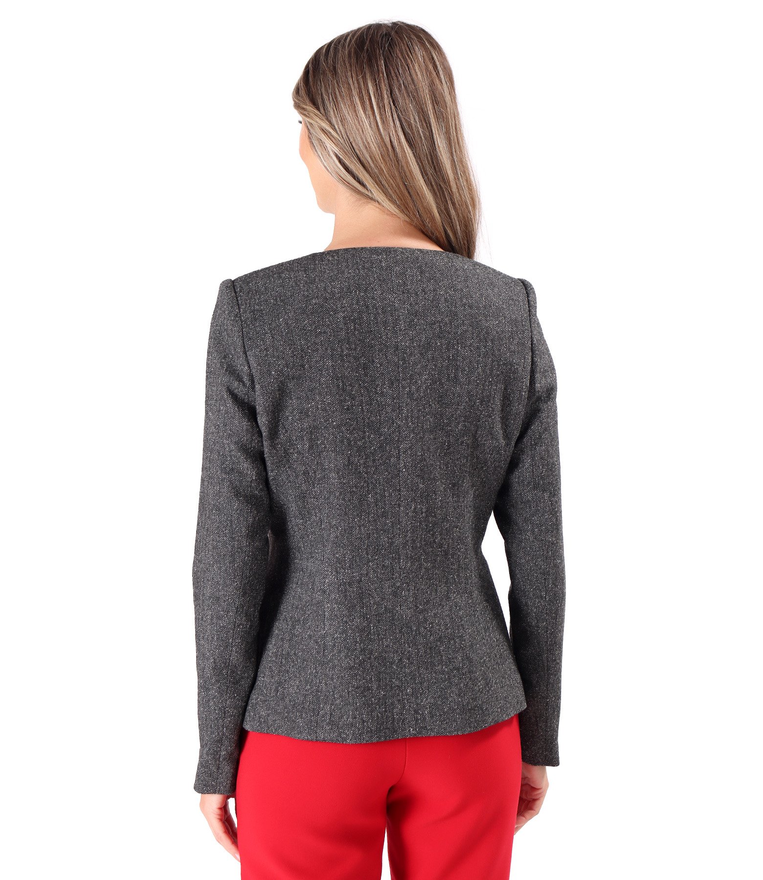 Office jacket made of wool and silk fabric, with black velvet trim at the neck and side pockets. It closes with a metal zipper on the middle of the front.
