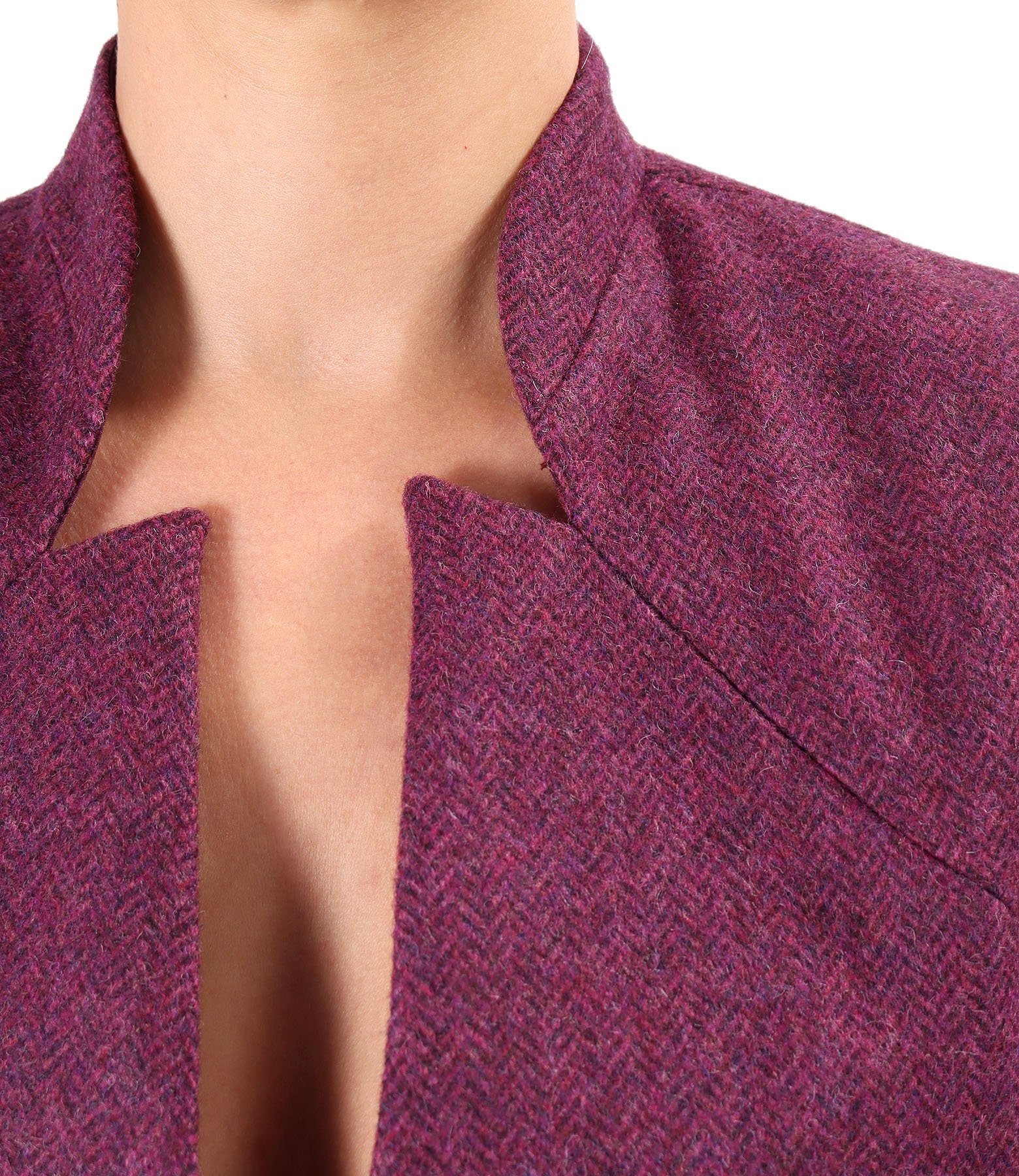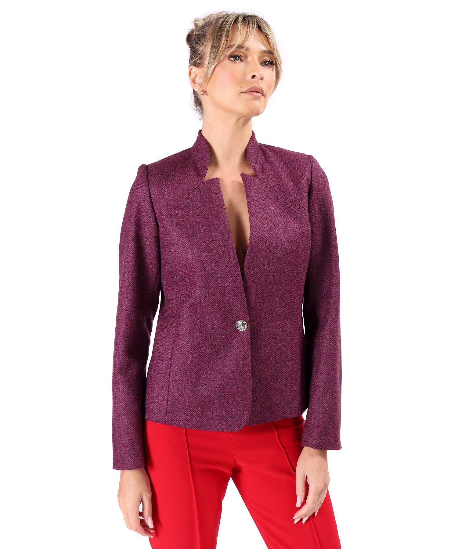 Office jacket made of wool fabric, lined with viscose, with a tunic-like collar. It closes with a button on the middle of the front.