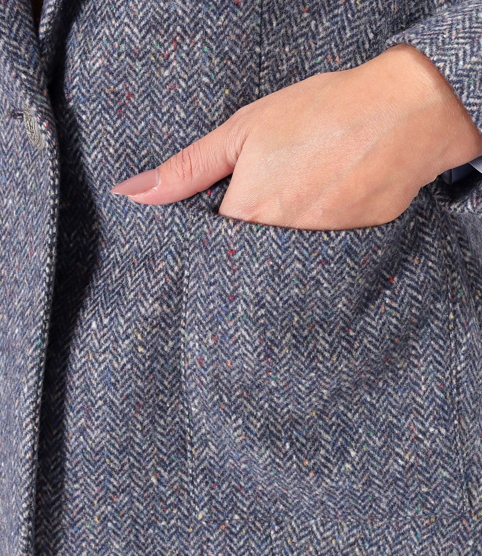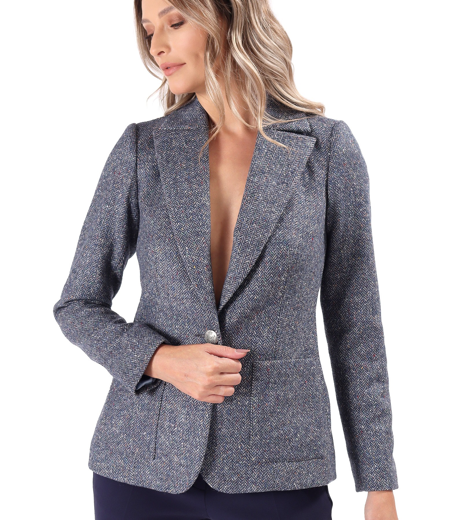 Office jacket made of wool fabric, lined, with a deep neckline, pockets applied on the front, and a slit on the middle of the back. It closes with a decorative button on the front.