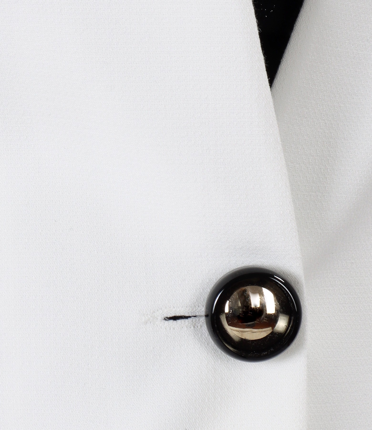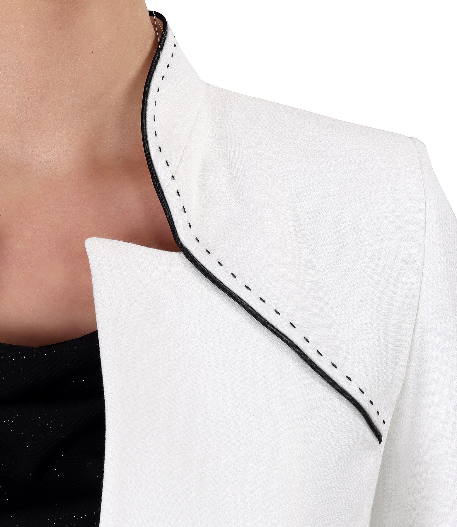Office jacket made of elastic fabric, lined with tunic collar and contrast stitching. It closes with a button on the middle of the face.