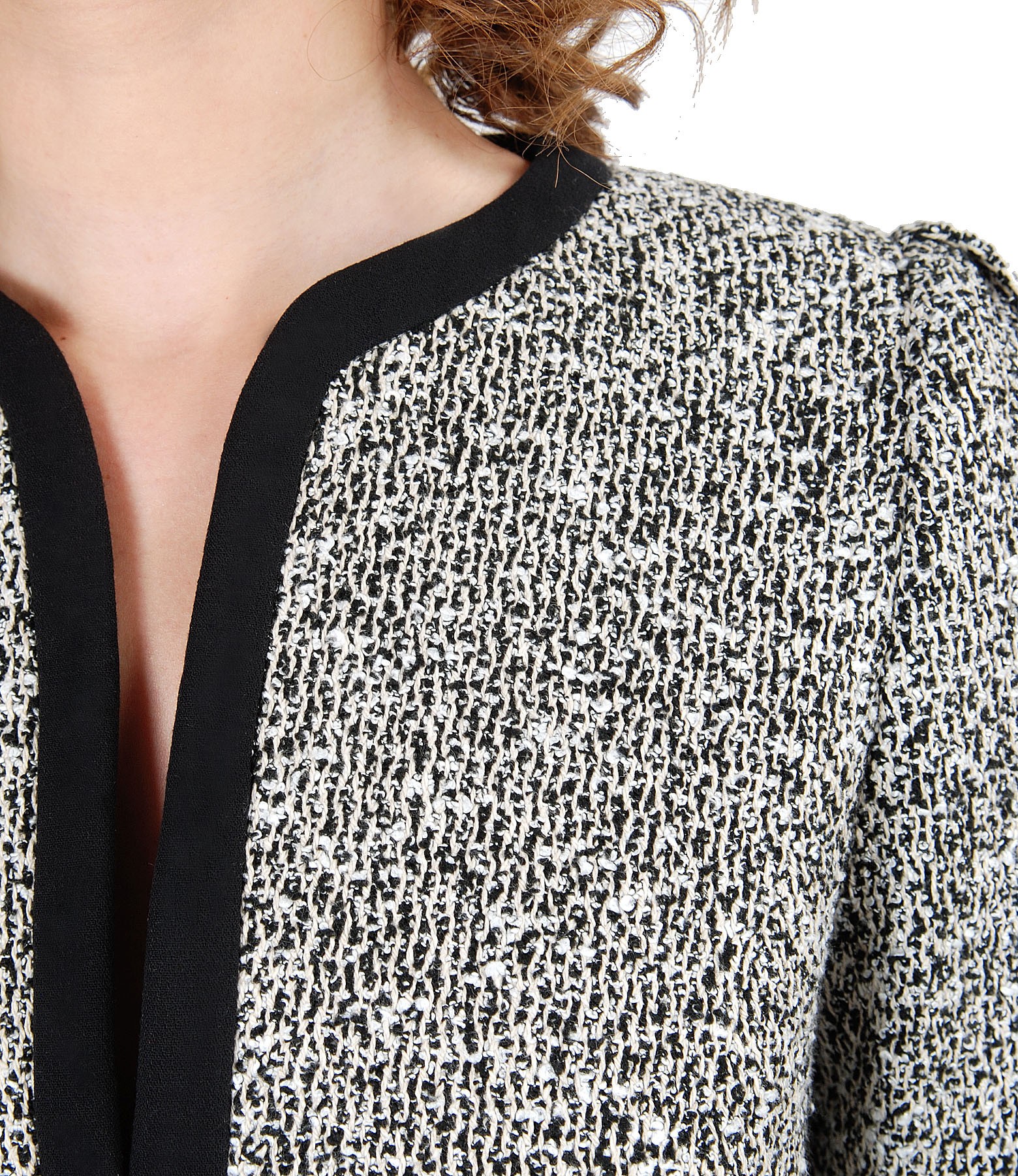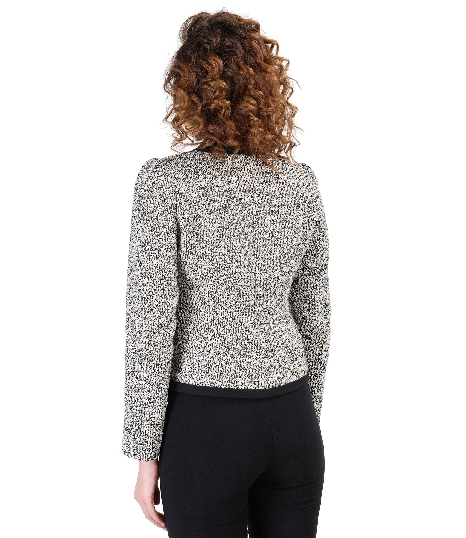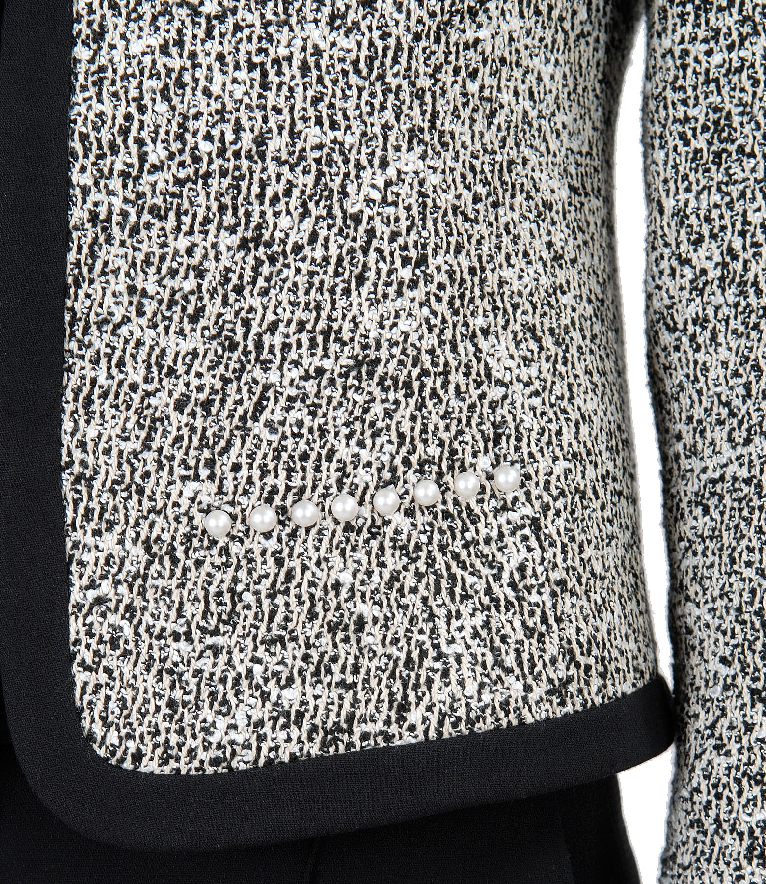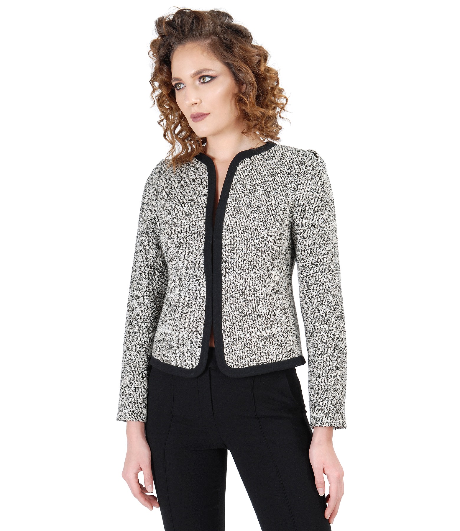 Office jacket with cotton loops, without collar, with trim, embellished with crystals on front. Closes with 3 front staples.