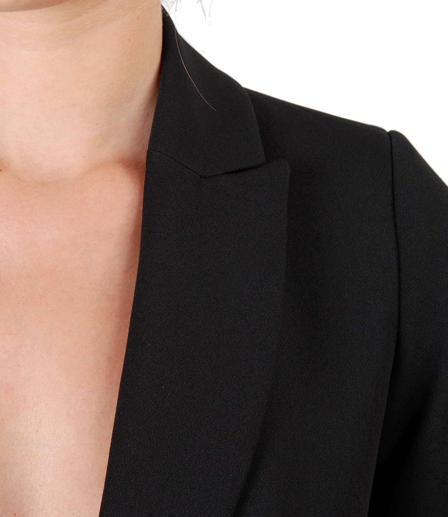 Office jacket with closed pockets and metallic zipper, padded, with deep low-cut neck. Closes with a front button.