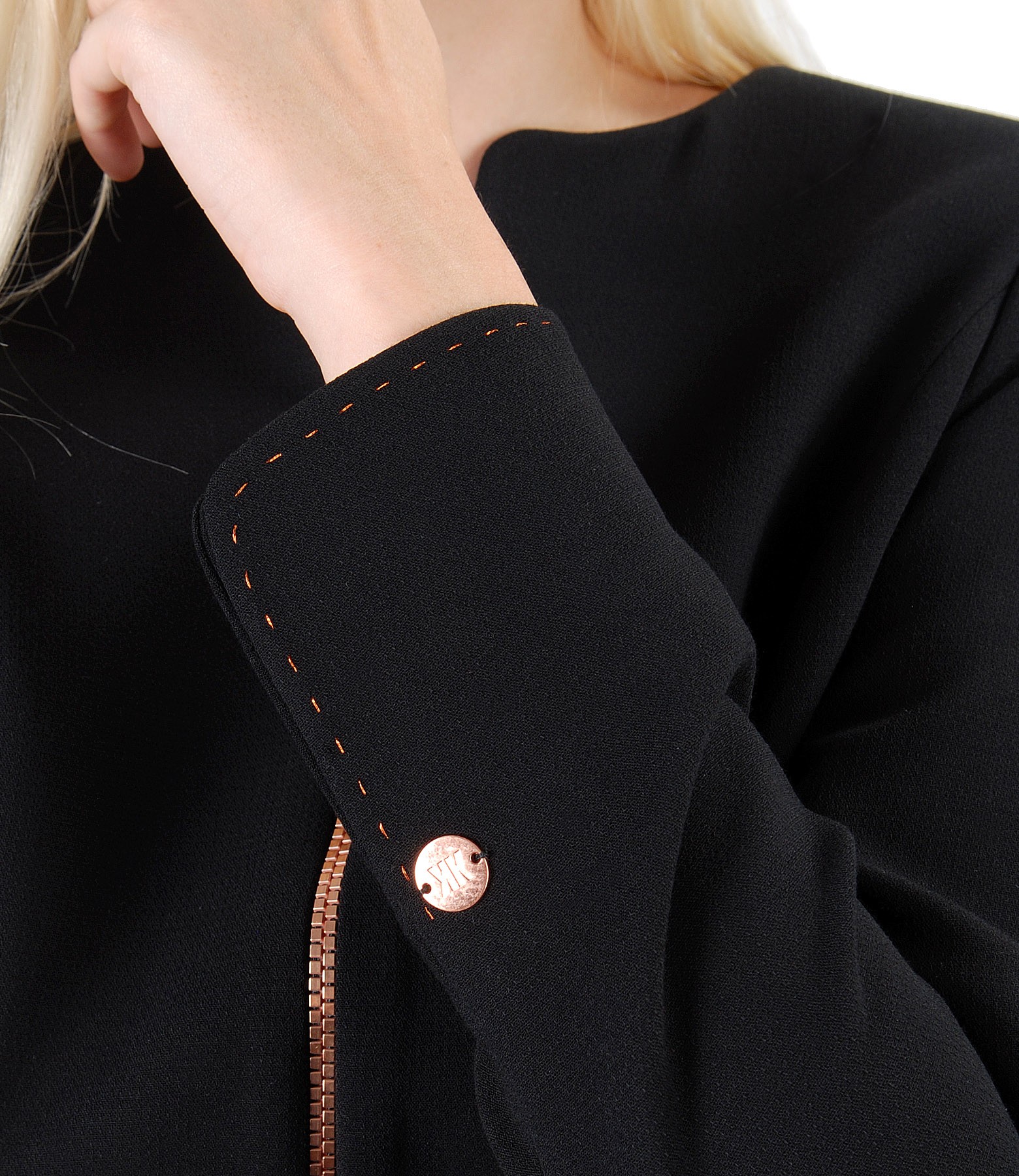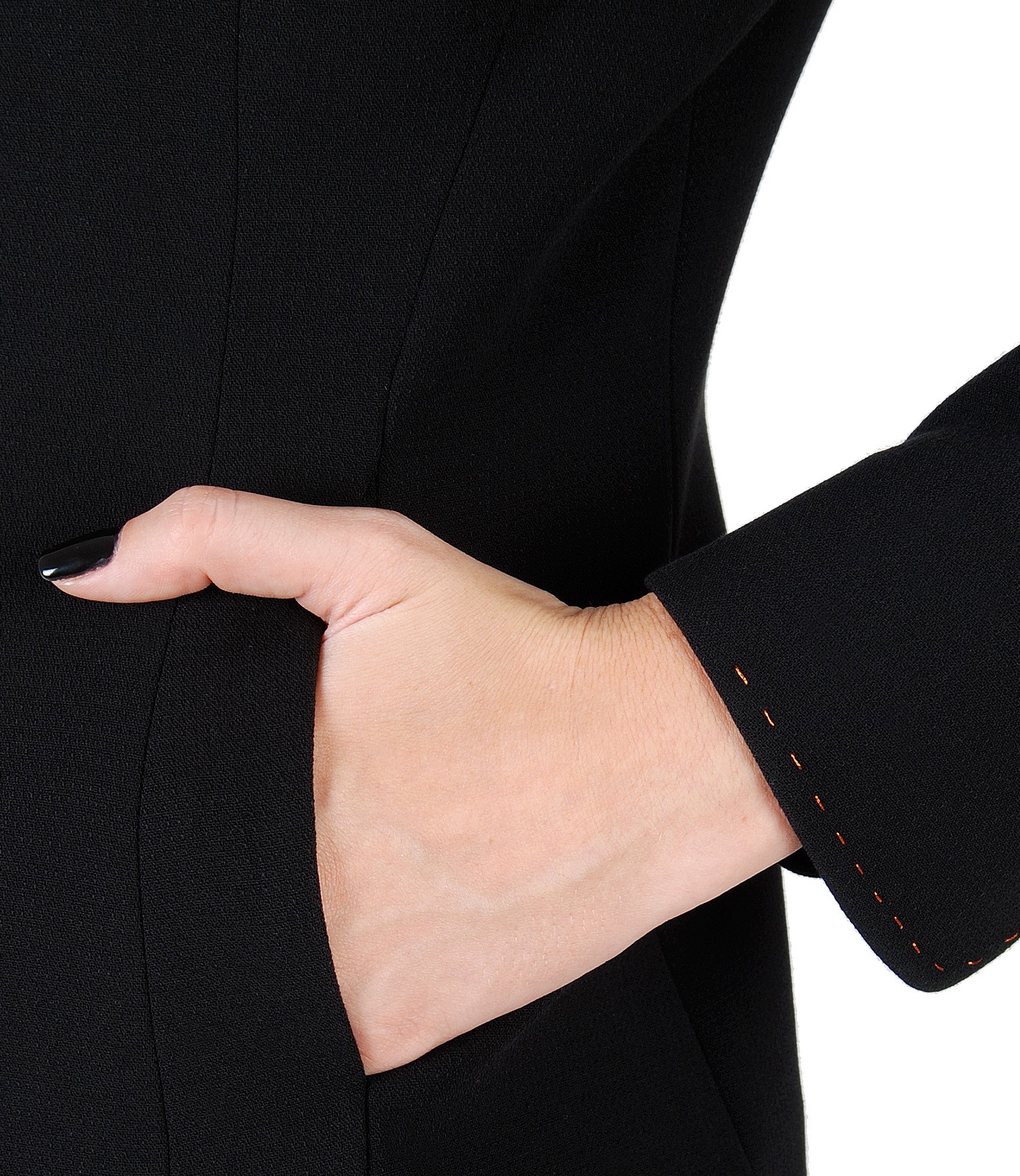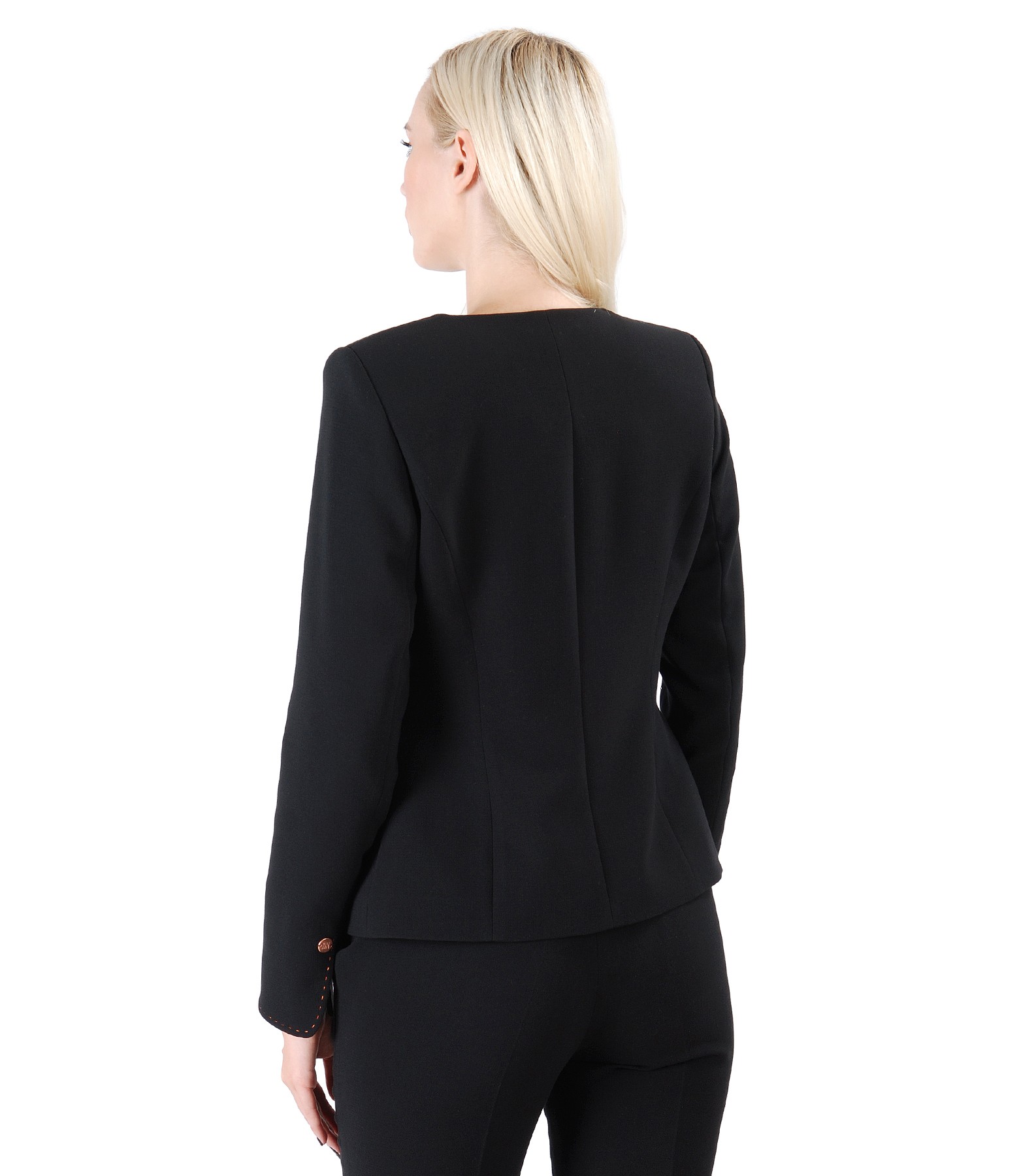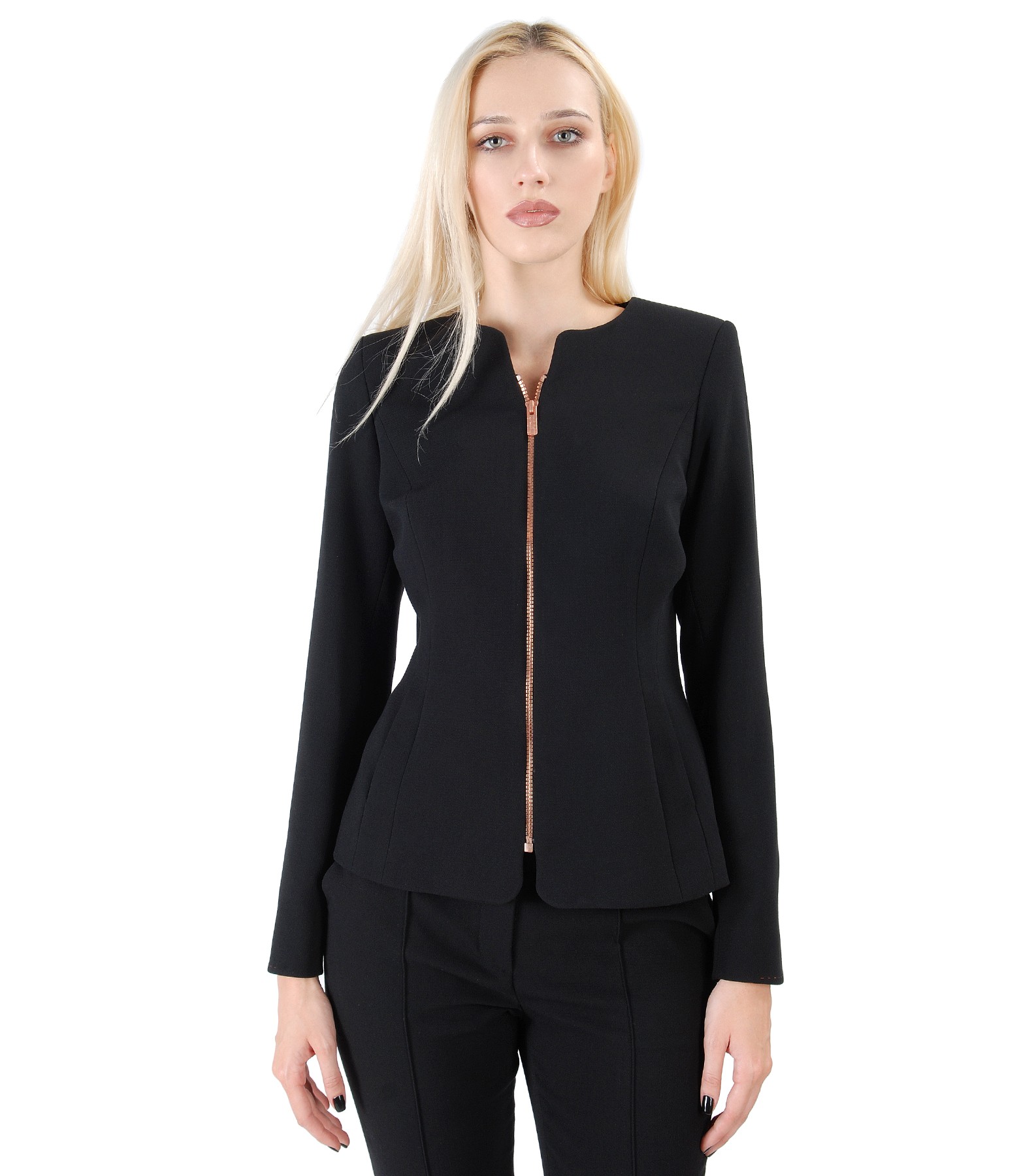 Office jacket made of elastic fabric, padded, with slits at the sleeves and side pockets. Closes with metallic zipper on the middle back.