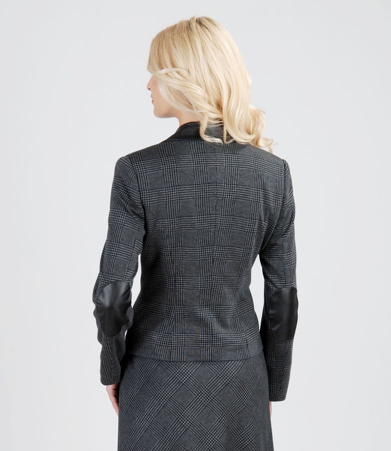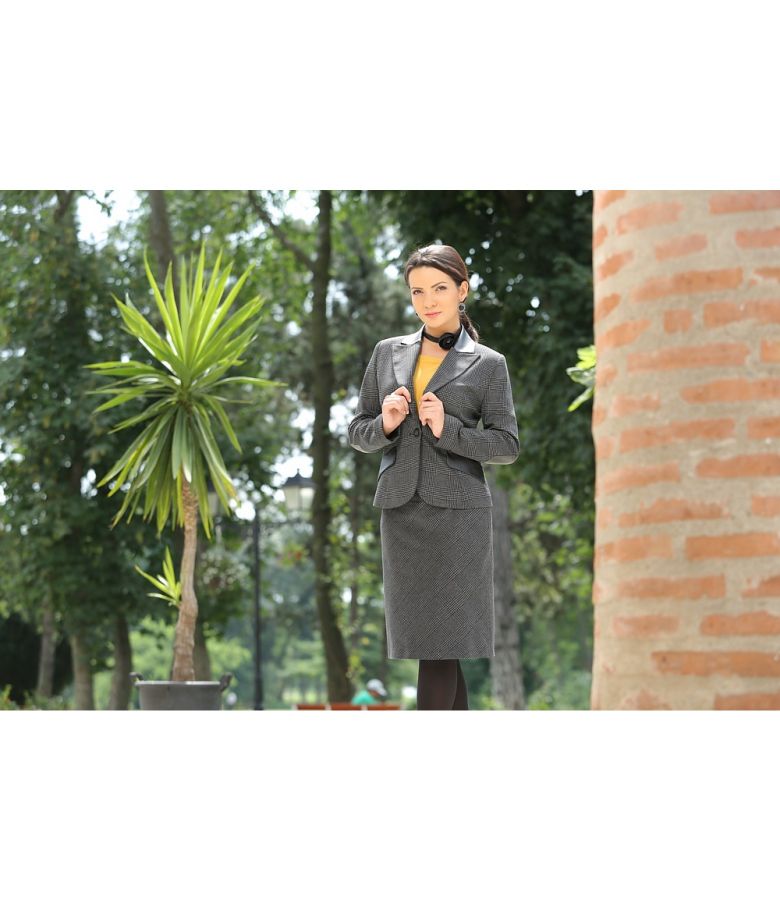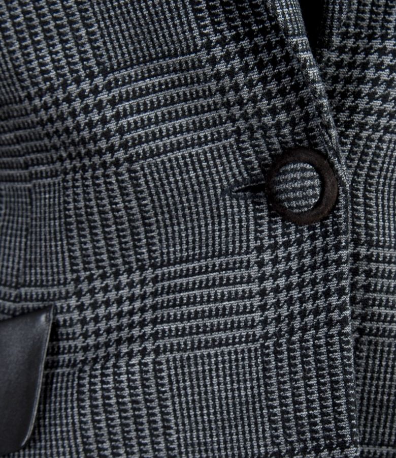Elastic fabric jacket with sharp collar and lapel. Two side flaps in waist and PU leather collar. Closes with one button on front.
