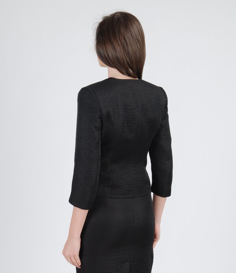 Puckered jacket with linen and viscose, with a slight satin effect, without collar, with flaps in waist. Closes on front with 3 hooks, marked with bows.