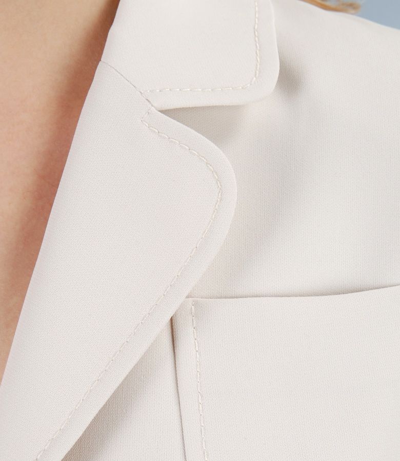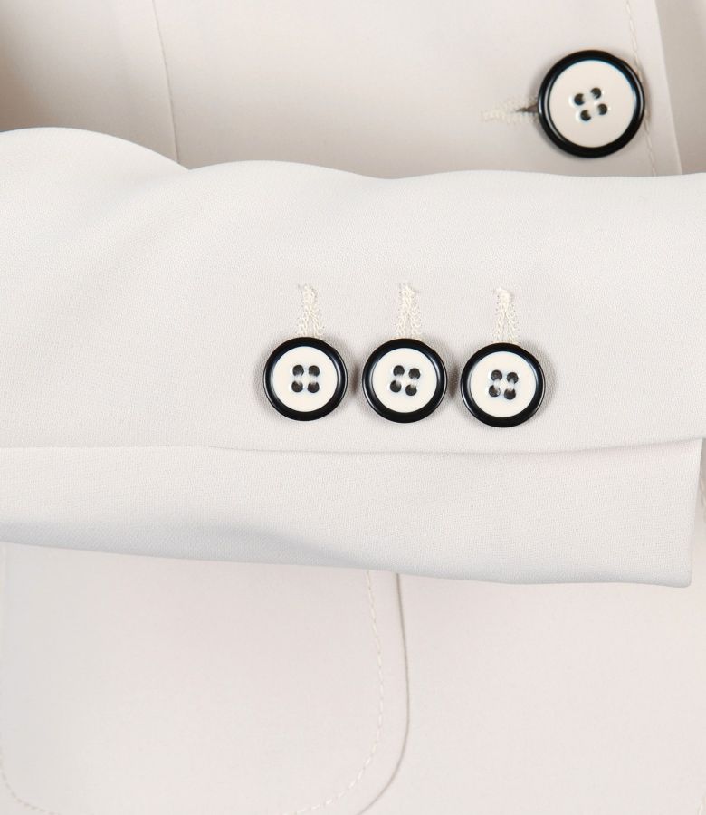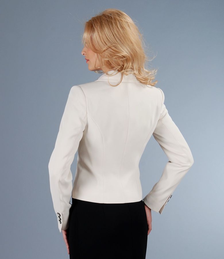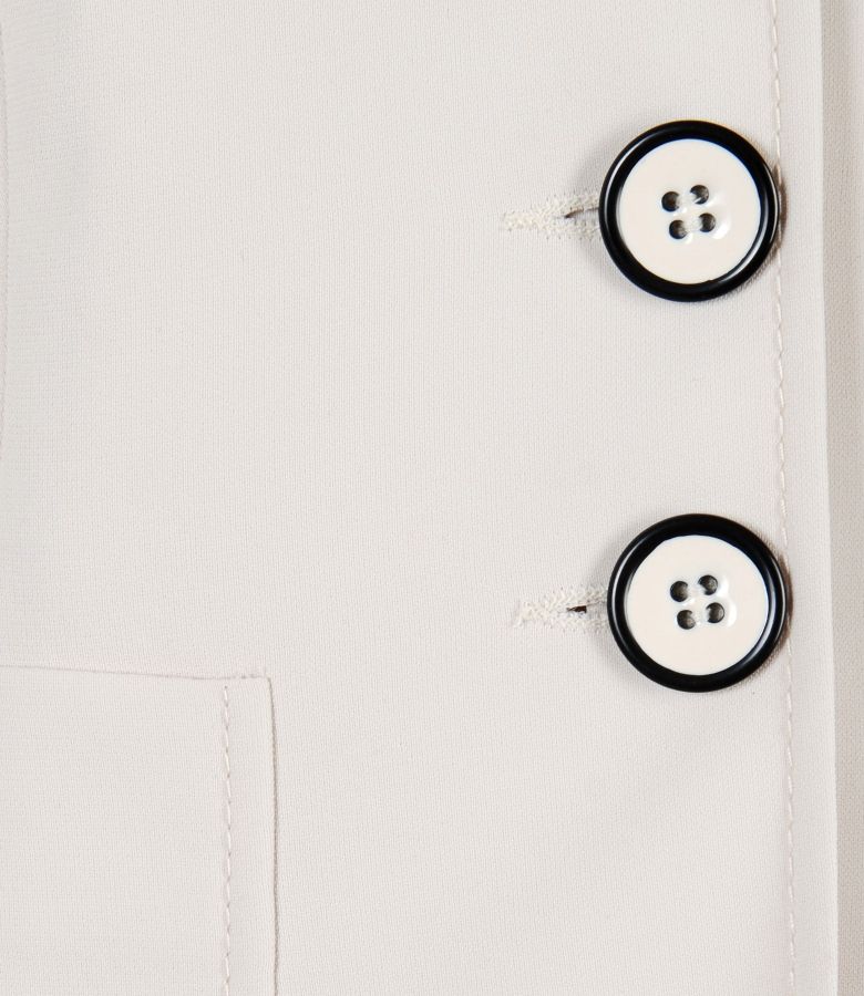 Button front jacket with collar and rounded lapels, long sleeves with fake slit closed with 3 buttons, pocket applied on the chest and two side pockets. Trim on collar and lapels.