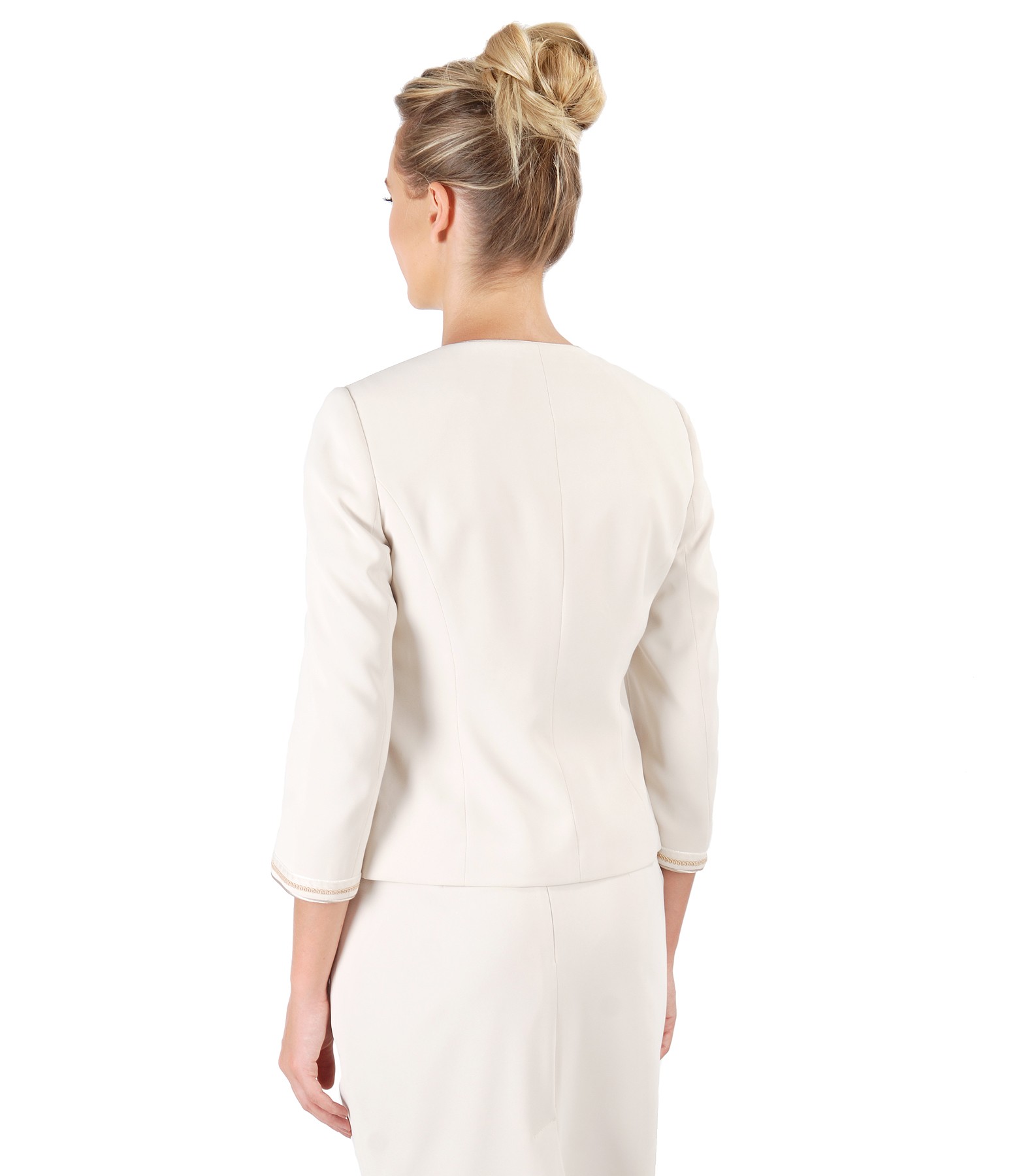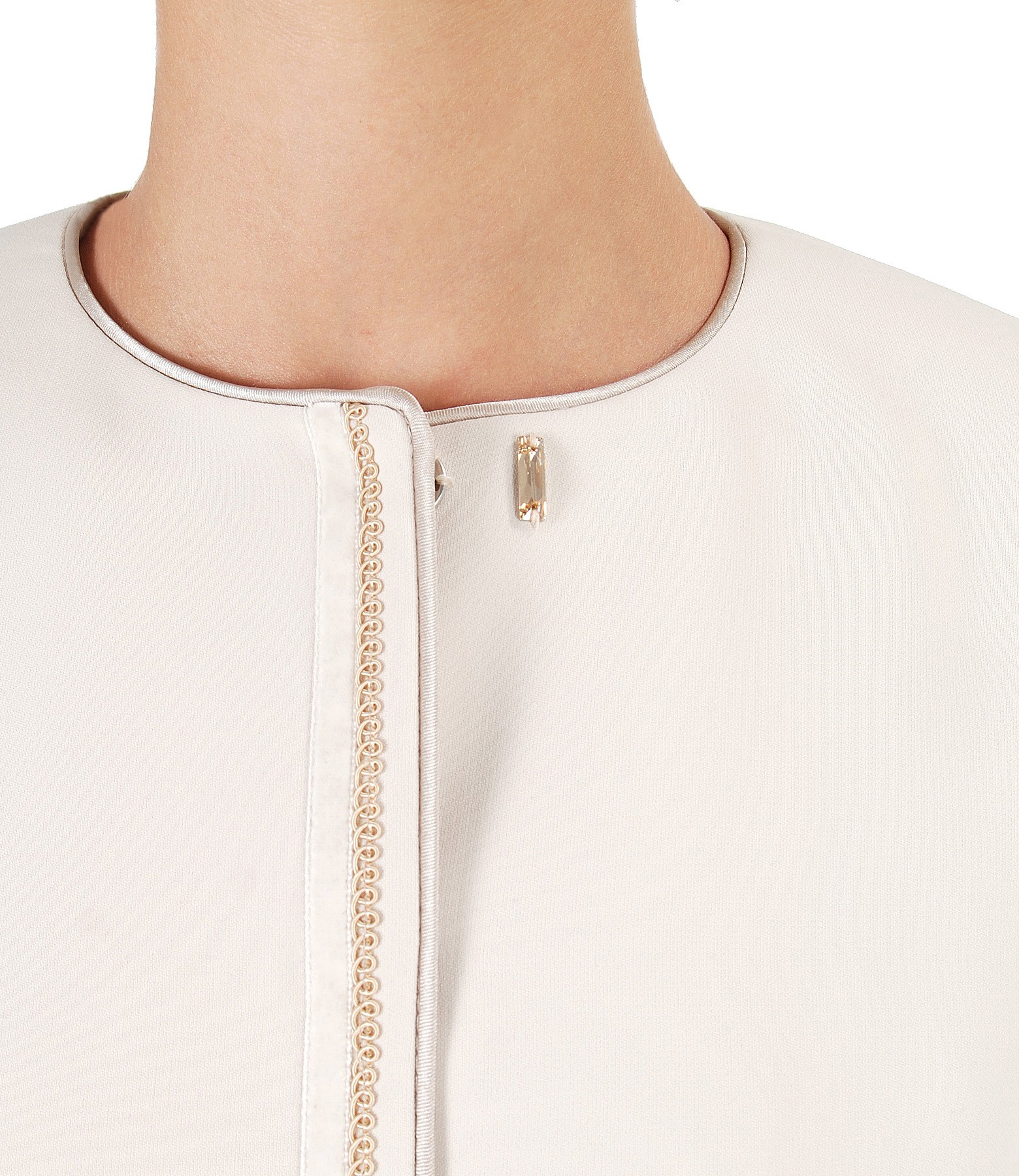 Office jacket, padded, without collar and lapels, with trim, embellished with crystals on the low-cut neck. Closes with 5 front staples.