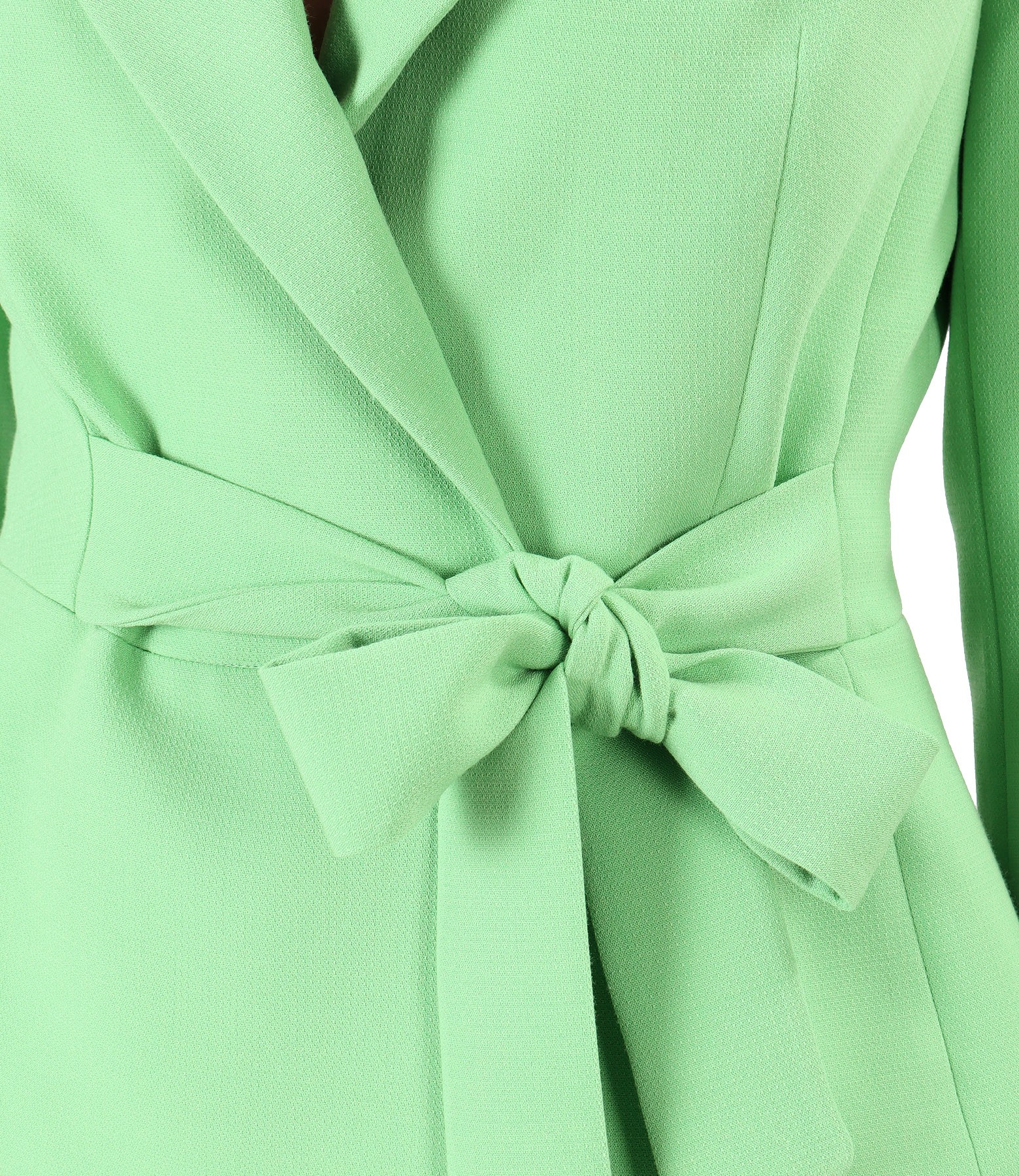 Office jacket made of elastic fabric with waist cord, without collar, with wide lapels with decorative pine and short slit in the middle of the back. It closes with 2 staples and a cord on the front.