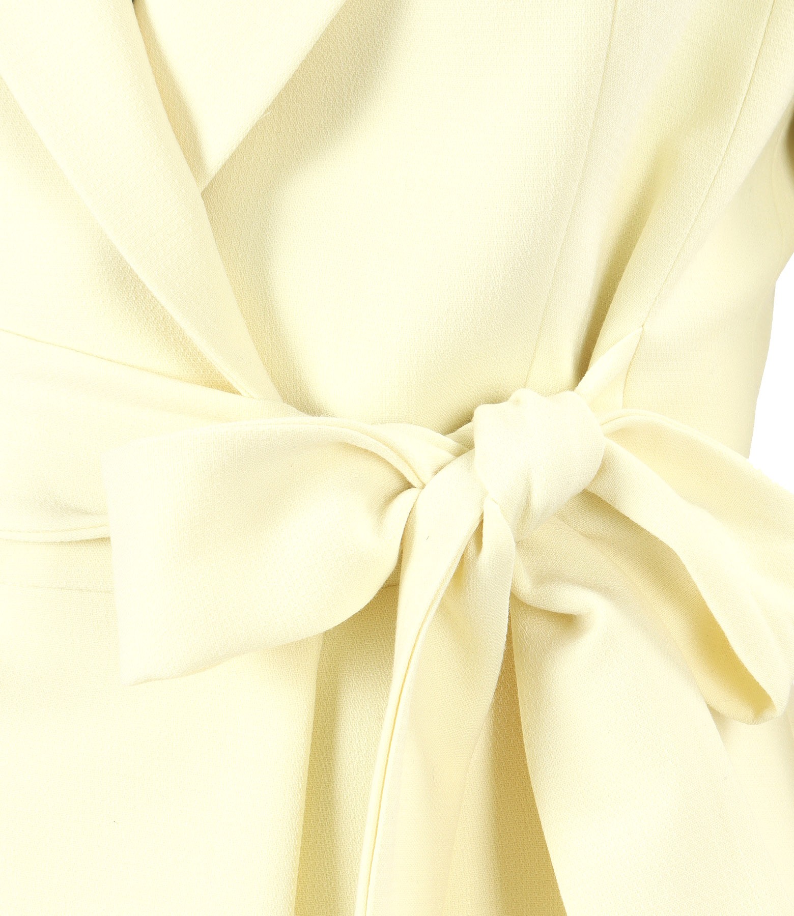Office jacket made of elastic fabric with waist cord, without collar, with wide lapels with decorative pine and short slit in the middle of the back. It closes with 2 staples and a cord on the front.