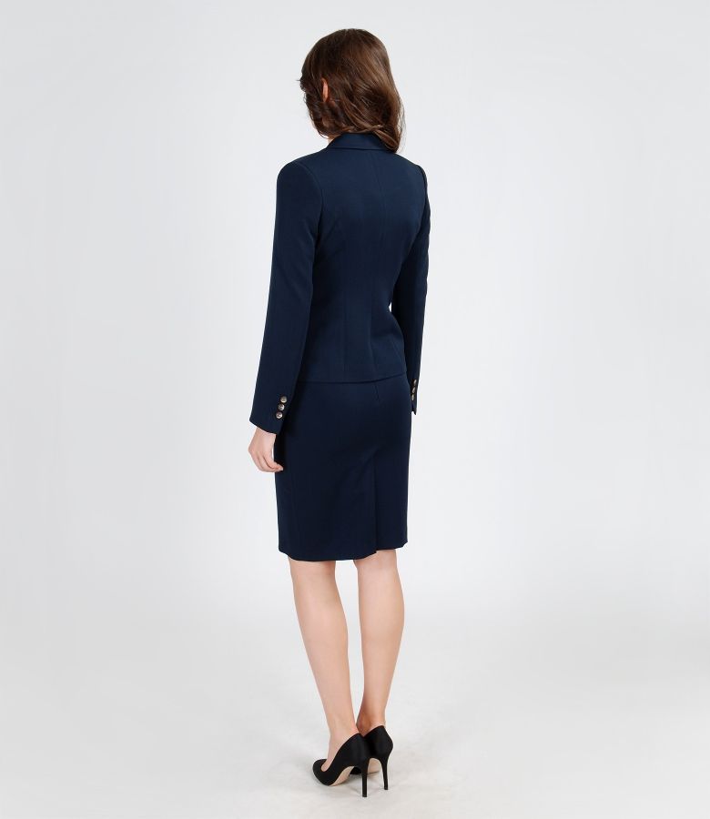 Elastic fabric jacket with deep neckline, fake side pockets on front and long sleeves with fake slit closed with 3 buttons. Closes with one button on front.