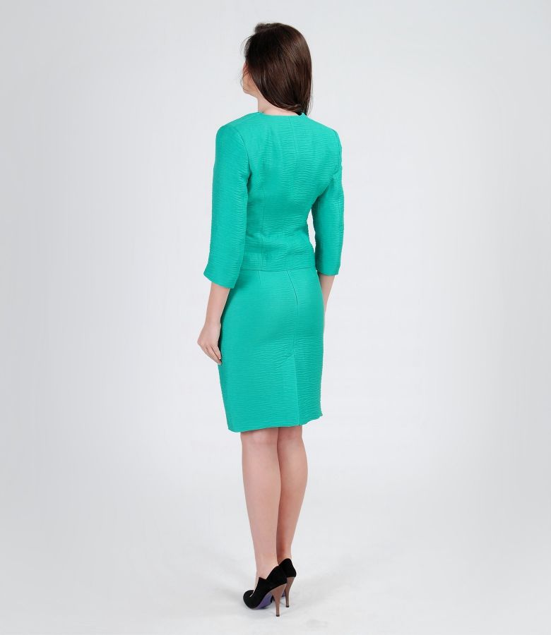 Puckered jacket with linen and viscose, with a slight satin effect, without collar, with flaps in waist. Closes on front with 3 hooks, marked with bows.