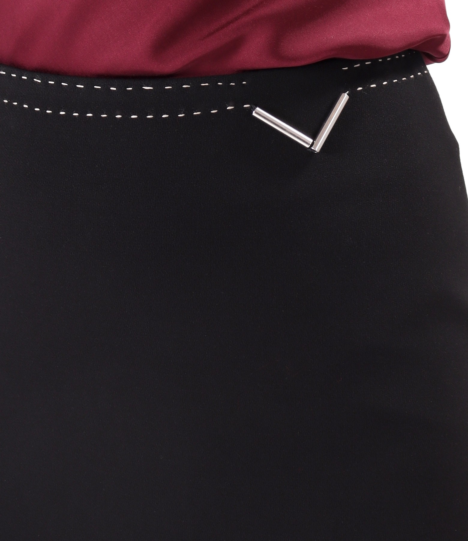Office skirt made of elastic fabric with viscose, lined, with decorative stitching in contrast and an ornament at the waist. It has a slit in the middle of the back. It closes with a hidden zipper in the middle of the back.