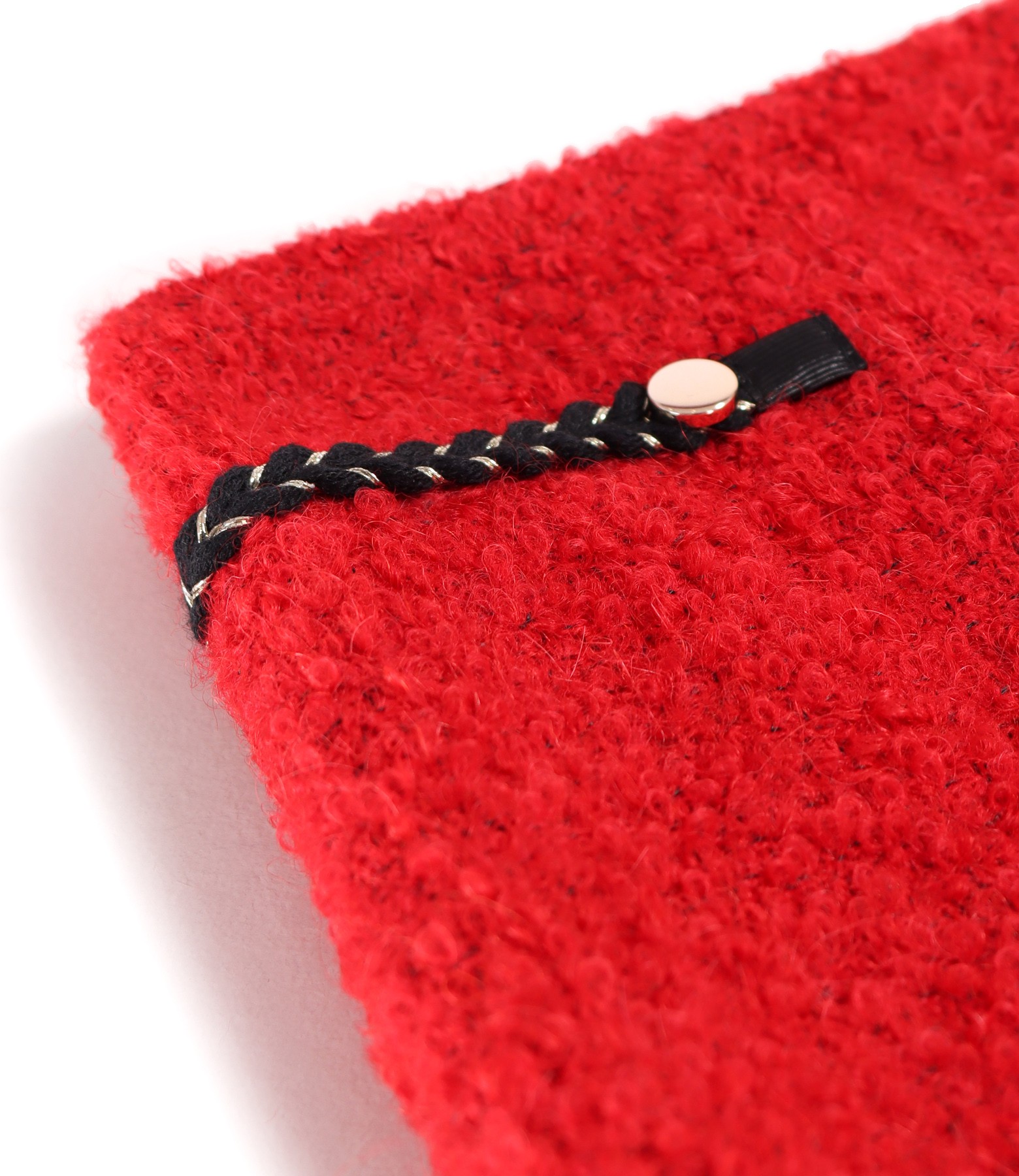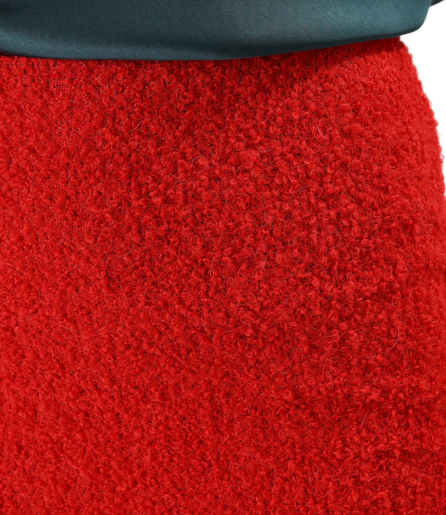 Office skirt made of loops with wool, lined, with trimmings in front and slit on the middle back. It closes with a hidden zipper in the middle of the back.