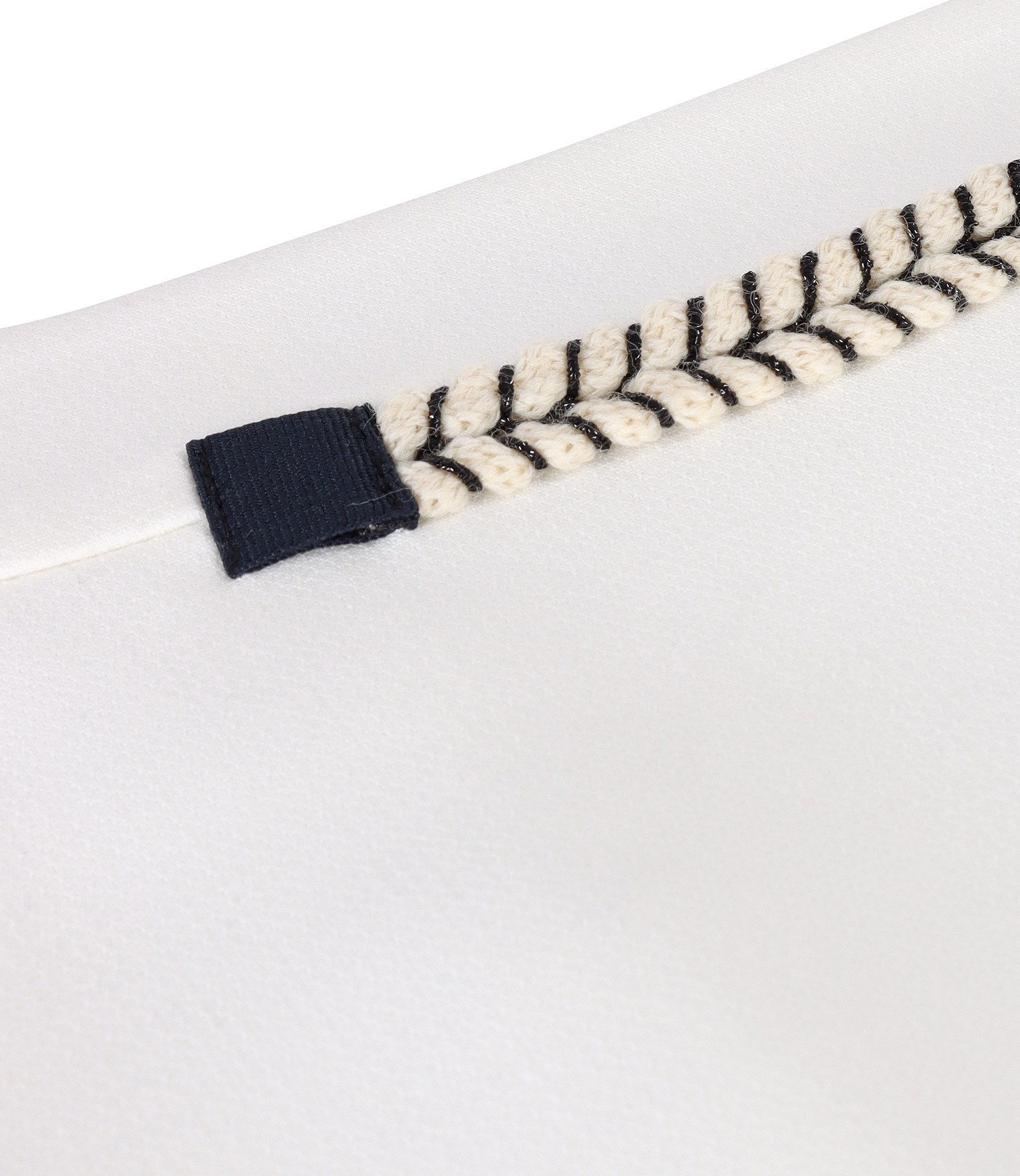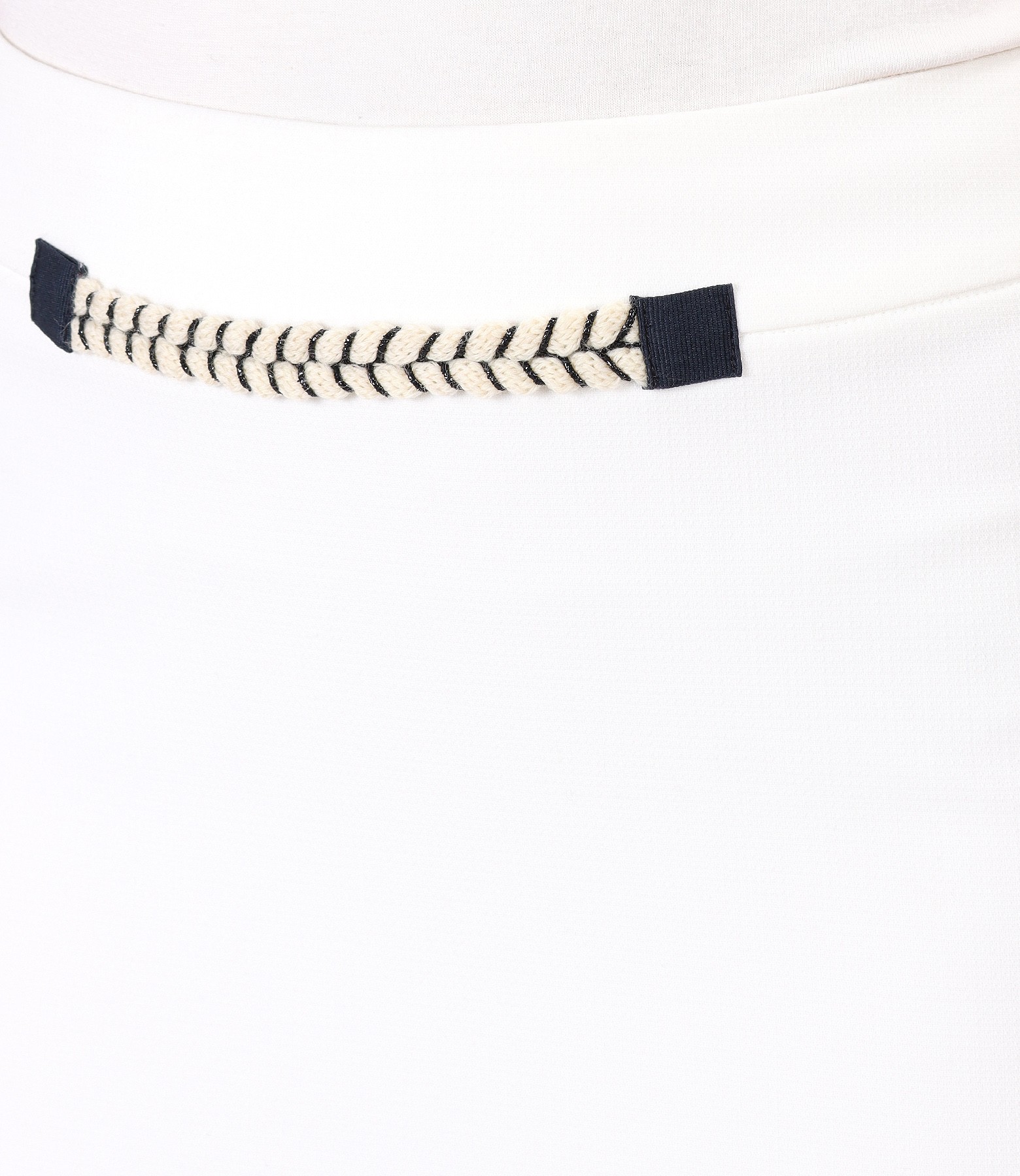 Office skirt made of elastic fabric, slightly tapered, padded, and with a wide drawstring at the waist and trimmings. It closes with a zipper hidden in the middle of the back.