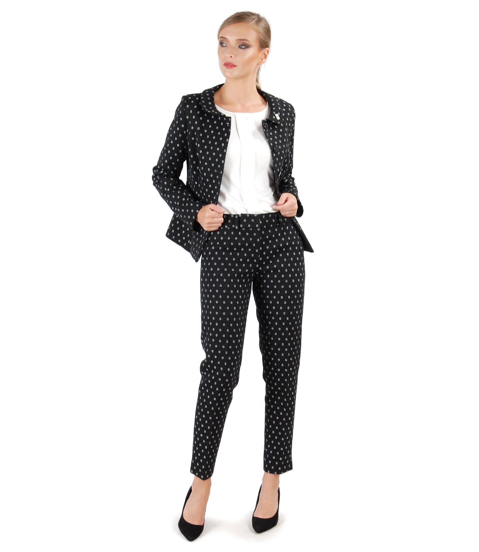Office jacket made of printed cotton, padded, with round collar and decorative pine on it.