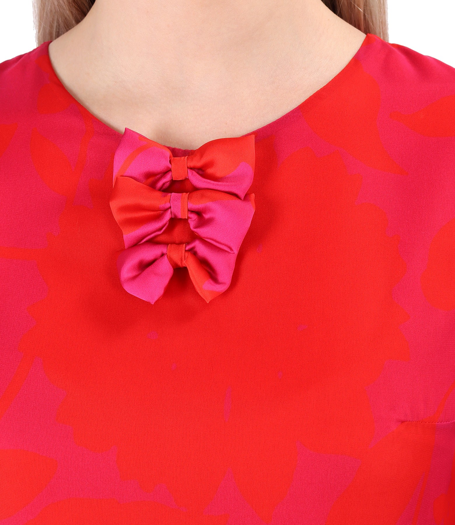 Organza veil midi dress printed with floral motifs doubled with viscose, long sleeves, and handmade satin bow sewn on the neckline. It closes with a zipper in the middle of the back.