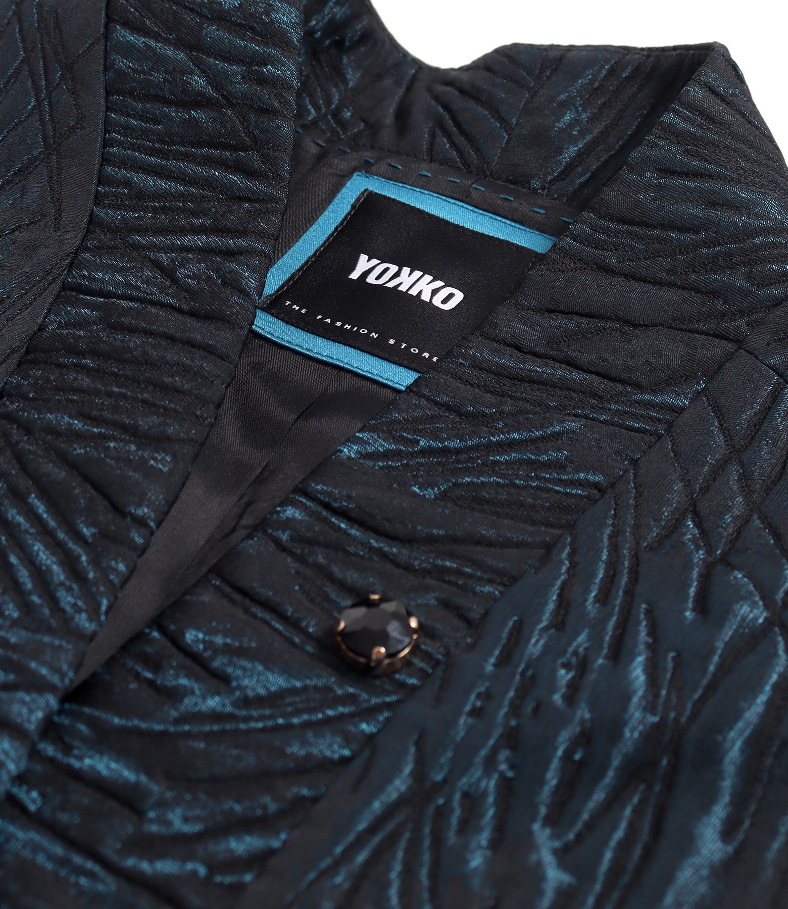 Oversized jacket made of versatile brocade with 3/4 sleeves, side pockets, and crystal embellishment at the neckline. No closure system.