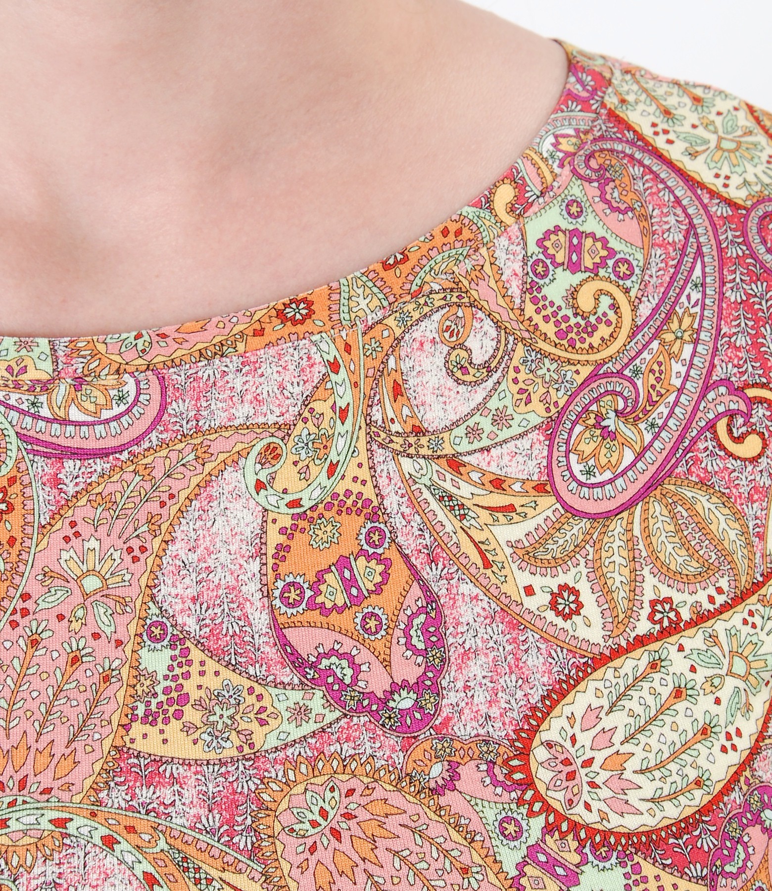 Blouse with boat low-cut neck in paisley printed jersey, with cap sleeves.