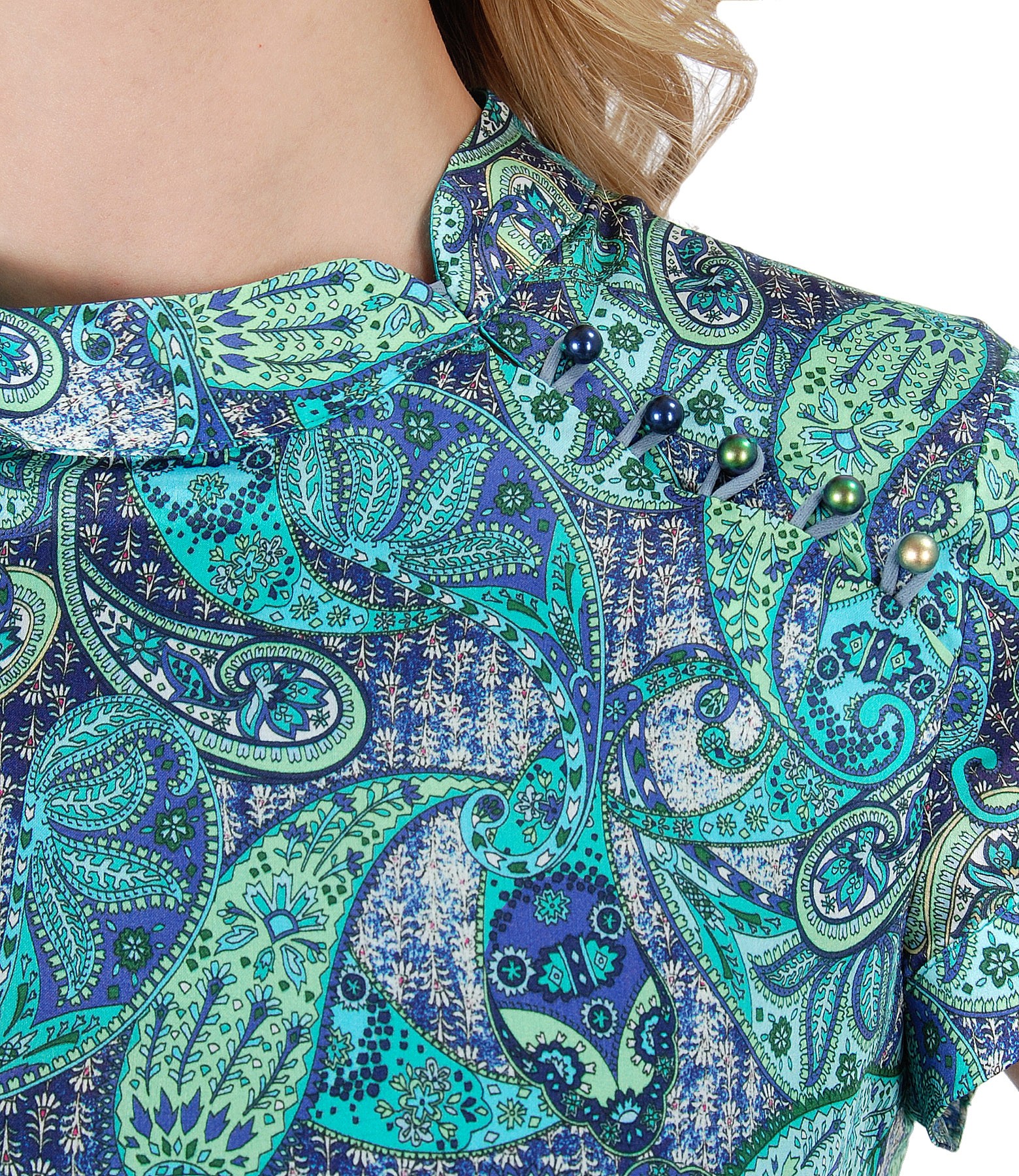 Evening dress made of silk with paisley print, lined with viscose, with tunic collar and slit on the left shoulder closed with 6 pearls. Closes with hidden zipper on the left side.