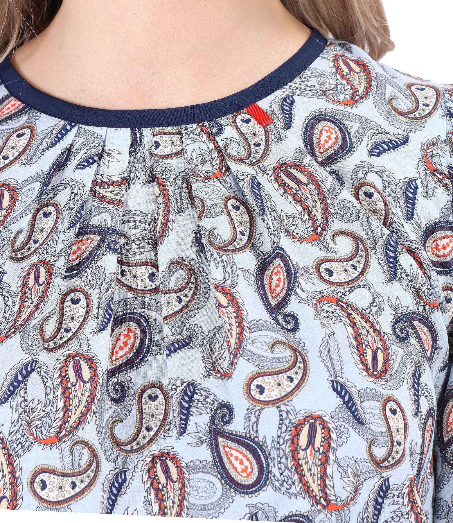 Printed viscose casual blouse, with 3/4 sleeves, with round neckline and folds on the front. Closes with a button on the middle back.