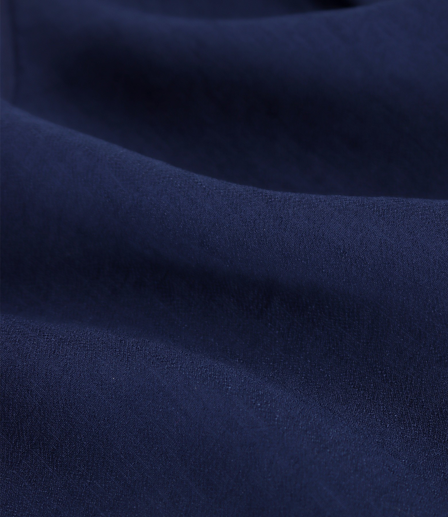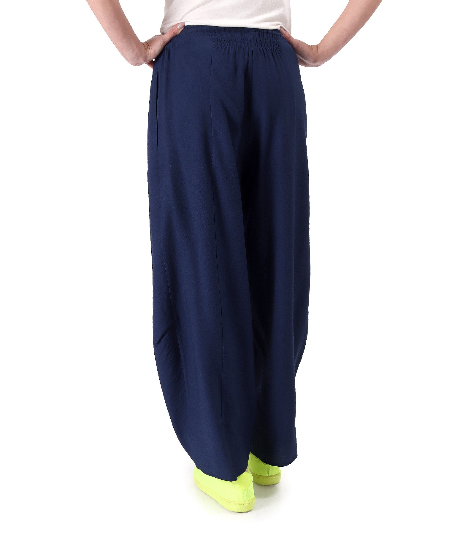 Pants made of creped viscose, side pockets, and elastic waist and cord.