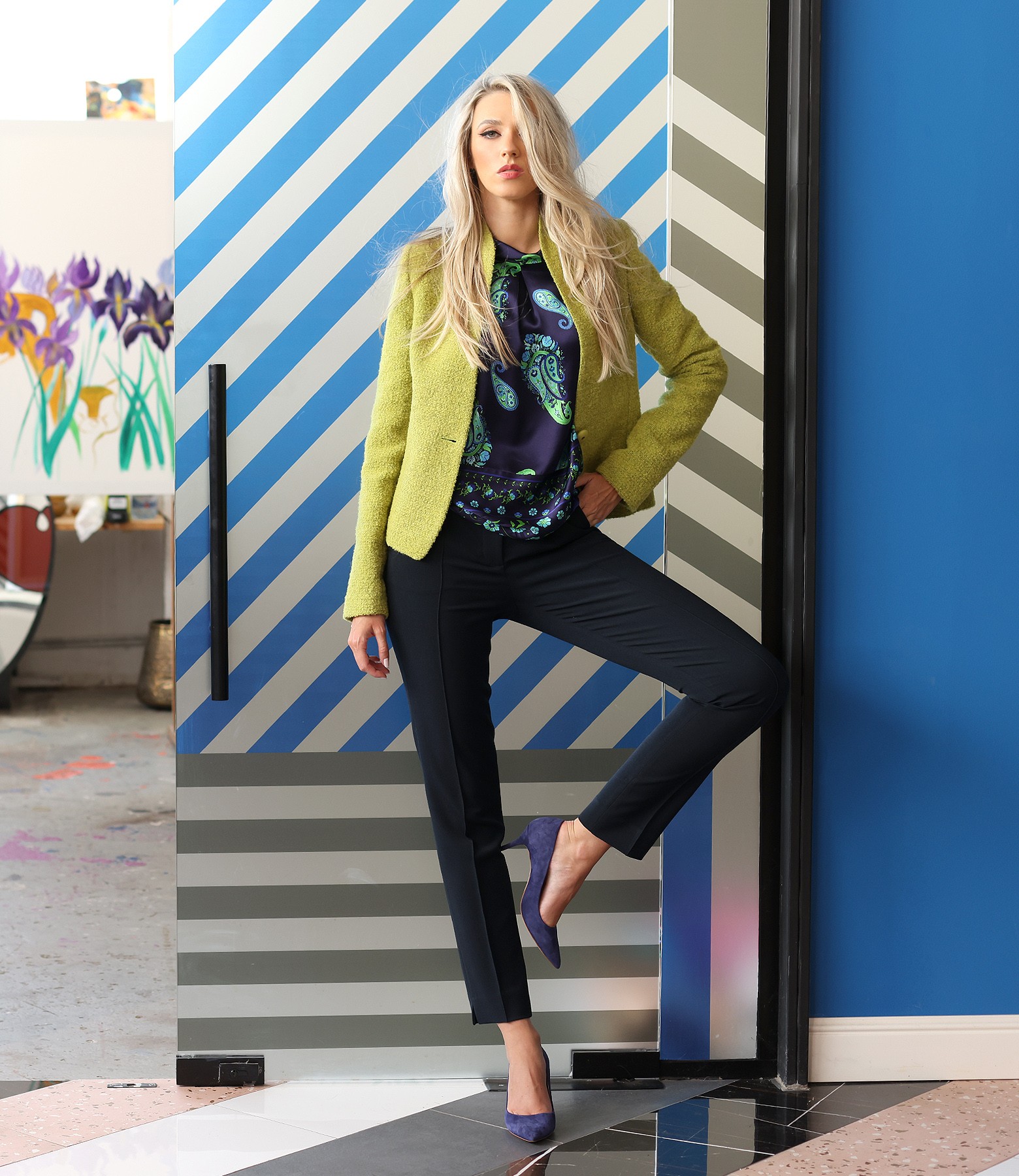 Pants made of elastic fabric with viscose, on the body, with a sewn stripe, wide cord at the waist, and oblique side pockets. They close with a normal zipper, counter button, and 2 staples on the front.