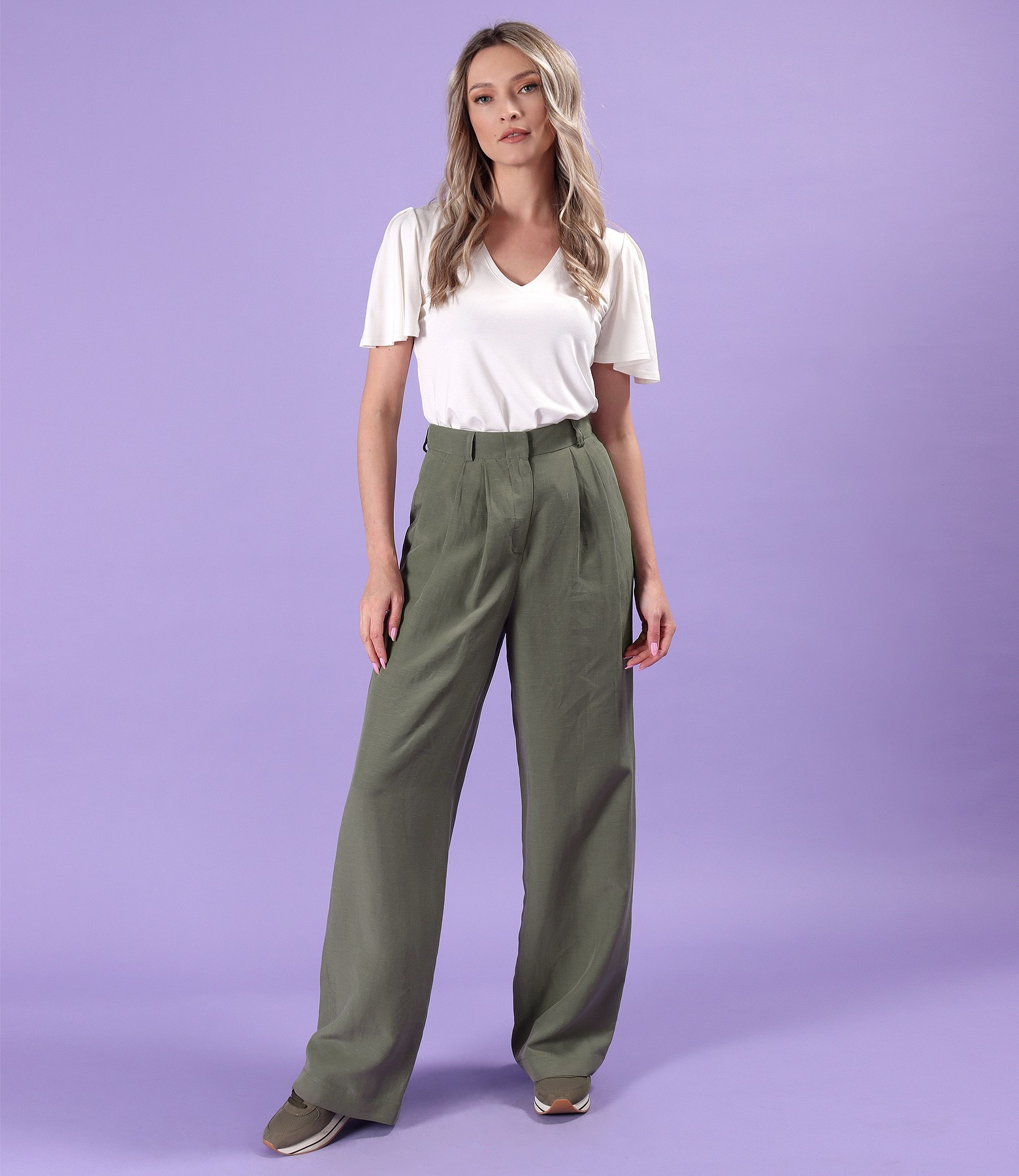 Pants made of tencel and linen, high waist with pleats on the front and side pockets. They close with a normal zipper and 2 staples on the front.