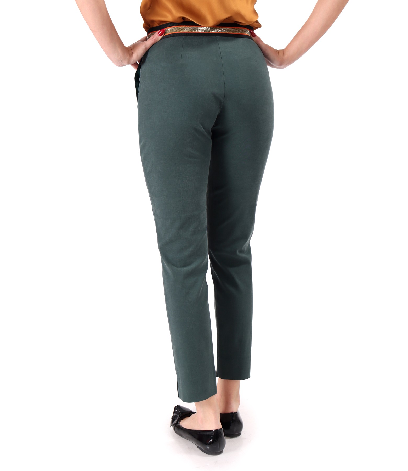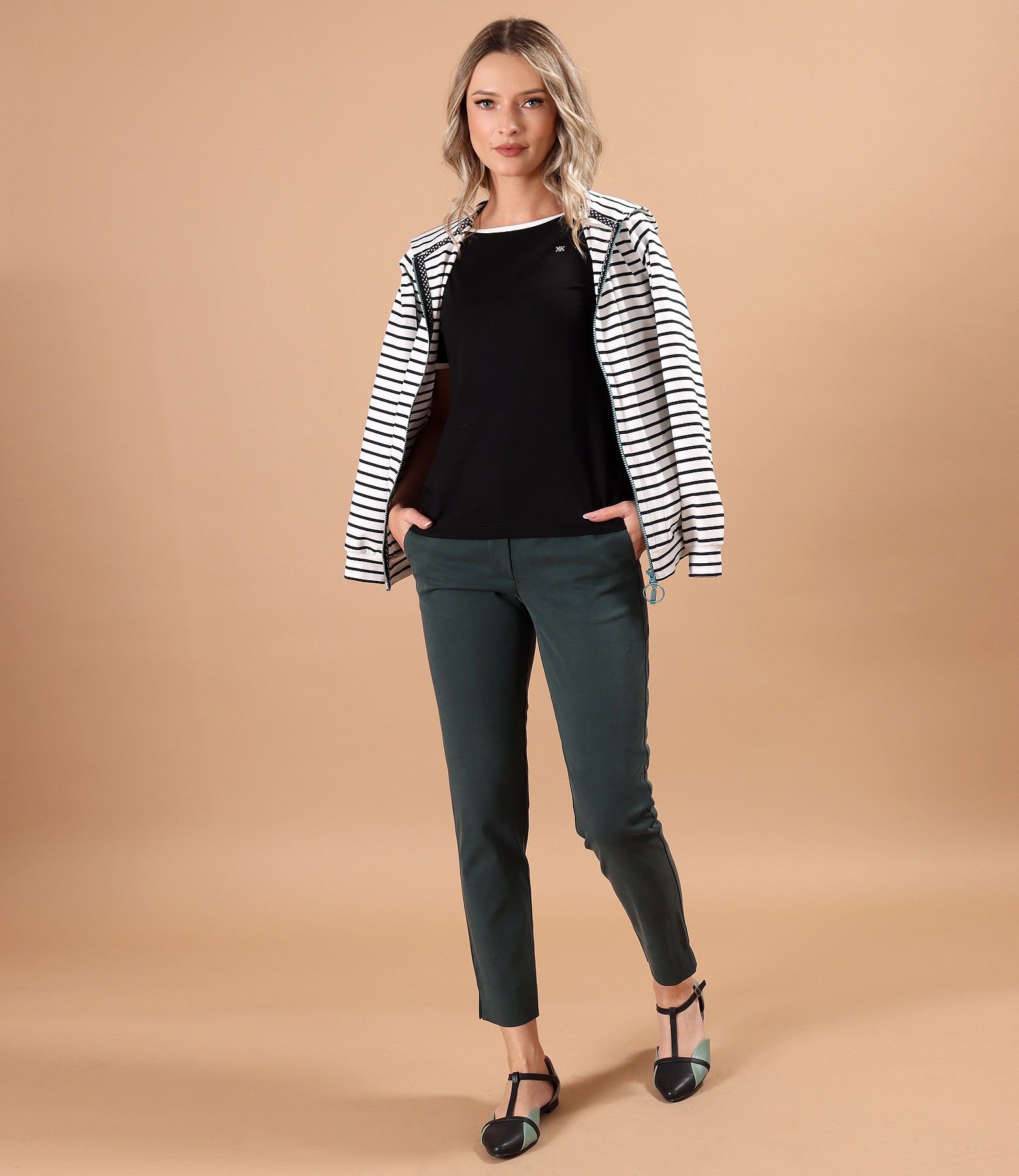 Ankle pants made of tencel fabric with cotton, with pockets on the front and a decorative elastic band with crystals at the waist. They close with a regular zipper, a counter-button, and 2 snaps on the front.