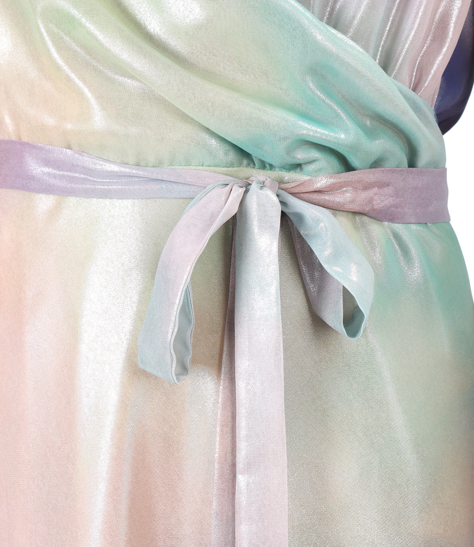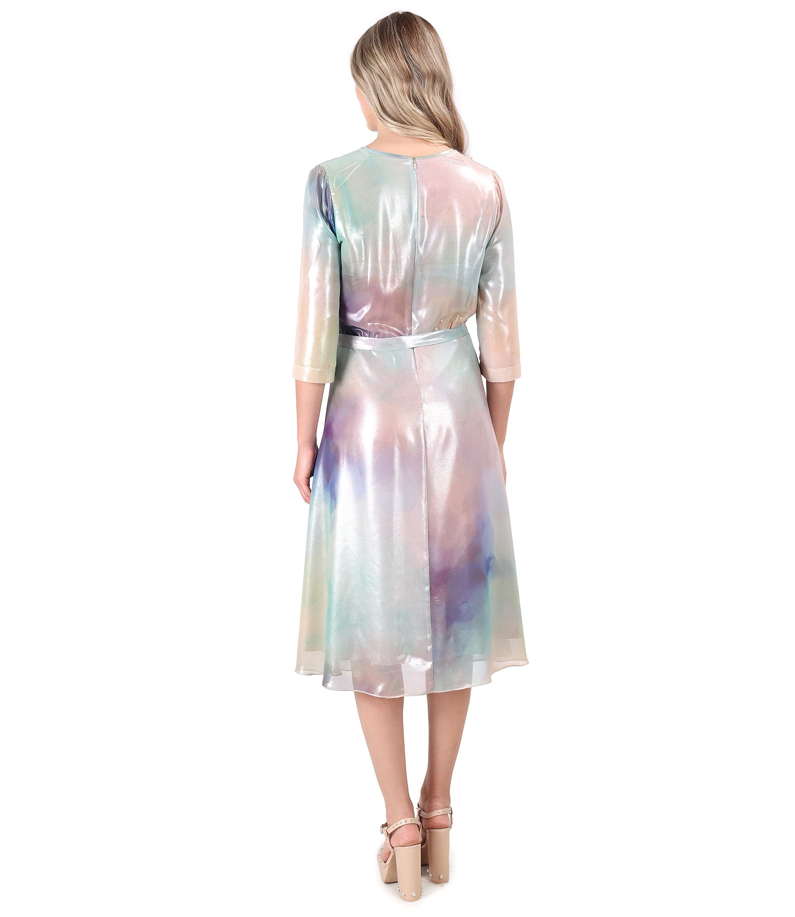 Pearl veil evening dress, padded with viscose, with 3/4 sleeves, pleated chest, drawstring waist. It closes with a zipper hidden in the middle of the back.