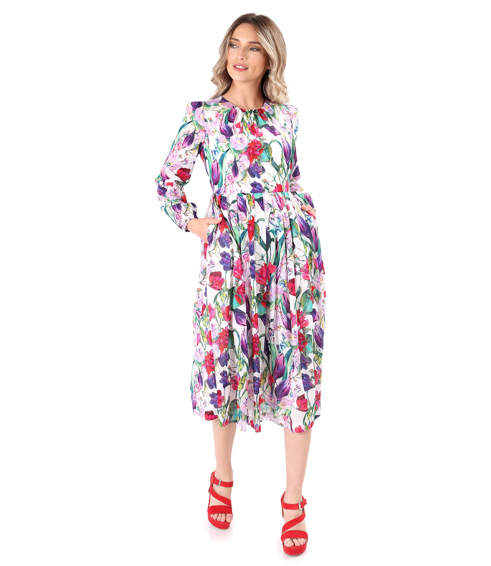 Digitally printed cotton veil midi dress with floral motifs, lined with viscose, with side pockets, long sleeves wrinkled at the end, round neckline, and pleats on the front and back. It closes with a hidden zipper on the middle back.